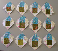 I was also bored with sewing these square in a square blocks. So I have blocks on the go at each stage - some have one triangle on, some have two, some have three and some are ready for trimming. This is a typical scene at my sewing machine. I have had trouble with my wrists with all the trimming (240 blocks to trim!) so as soon as I get 10 blocks with all four triangles on, I stop sewing and trim those blocks. Trimming a few blocks at a time has helped with the wrist pain. Thanks to Sara for this suggestion!