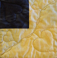 I started with quilting long heart trails, which went across the quilt on the diagonal, the cream blocks with beige thread and the dark blocks with black thread. Then I decided to quilt a curving line back along the vine and make it look more like a ribbon and I liked it better. Then I quilted 4 hearts in the 4 patch block. The