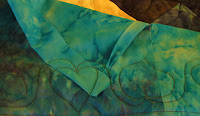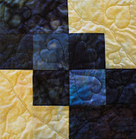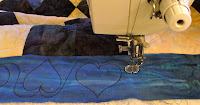 I had a lot of fun quilting hearts this week and on the left is a photo of the continuous line of hearts I quilted on the borders. It was going along quite well with limited thread shredding and breakage, which was a relief because the backing and top were batik fabrics and the batting was a mystery batting that I found in my cupboard (not my usual Warm & Natural) so I was unsure of how this would quilt up.