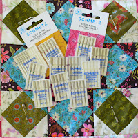 I finished quilting the 20 star blocks (see them here) and then moved on to the outside of the stars. I wanted to use a Sulky Blendable thread but it kept breaking. I am pretty stubborn when it comes to making a thread/needle combination work and tried all of these various needles. I was about to give up and thought to check the website for the Blendable threads and read that a topstitch 90/14 needle is recommended...it's the only needle I didn't have of course. The 80/12 (the embroidery, the quilting and the topstitch) needle was still breaking the thread. I sent my husband to the sewing store on the way home from work today to pick up the topstitch needles and I am eager to see if