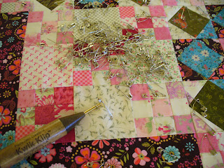 got to work on it. I never really know what kind of a quilting design I will make on a quilt until I actually start the quilting. I am like this with driving too (which makes my family a little frustrated on trips with me) and I just head out in the general direction of my destination and figure it out as I go along. On this quilt I know I will stabilize the quilt with stitch in the ditch around the blocks horizontally and vertically, and then I will quilt those long pink chains on the double 9 patch blocks. That decision helped me to know where to place the basting pins so I could do all of that quilting without removing any pins. And as I baste I will think about what else I might like to do with the quilting.