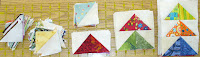 Here is a photo of the stages...a triangle scrap sewn into a HST, trimmed, then sewn with a matching friend to be a flying geese unit. I had many hours of fun matching up the flying geese units. This is the photo on my blog header.