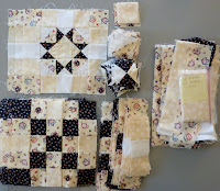 This brown one, which I really disliked, still has a few borders with it, one of which is a pieced checkerboard and is already sewn together, however, the original pattern was MIA...I think it might have been a mystery project from the late 90's. It was adopted by Lori S. and she has a person in mind to finish it for...I was so excited about that!