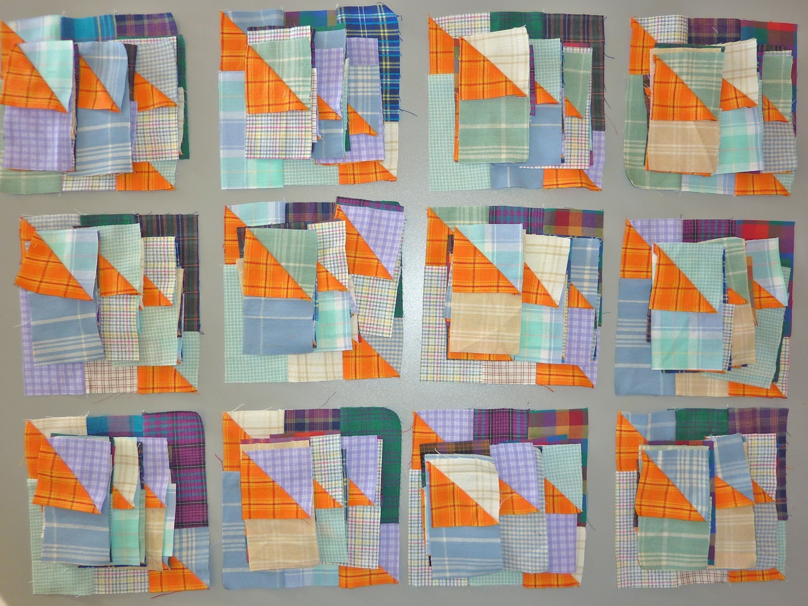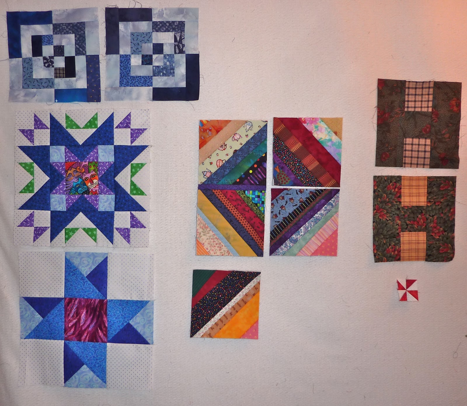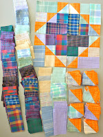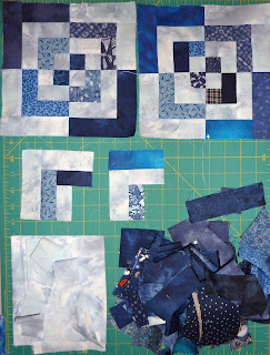 I took the batik blocks down while I think about what to do next and put up my guild's mystery quilt project. I have sewn 9 of the 12 blocks. The remaining 3 blocks have been cut and the pieces are in the plastic sleeves at the bottom of the design wall, all ready to sew. All of these blocks have been made from my bright scraps... only the background fabric was purchased.