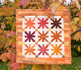 These asterisk blocks finished at 2" and the mini quilt measures about 10.5" square. It doesn't take a lot of scraps to make a block...try it you'll like it! I found the instructions here on the Selvage Blog and just kept making smaller blocks until I was happy with the size. I used up a few more scraps on the cornerstones and border/backing/binding, and then we went outside for a photo shoot in the tree in my backyard...it fits in perfectly!