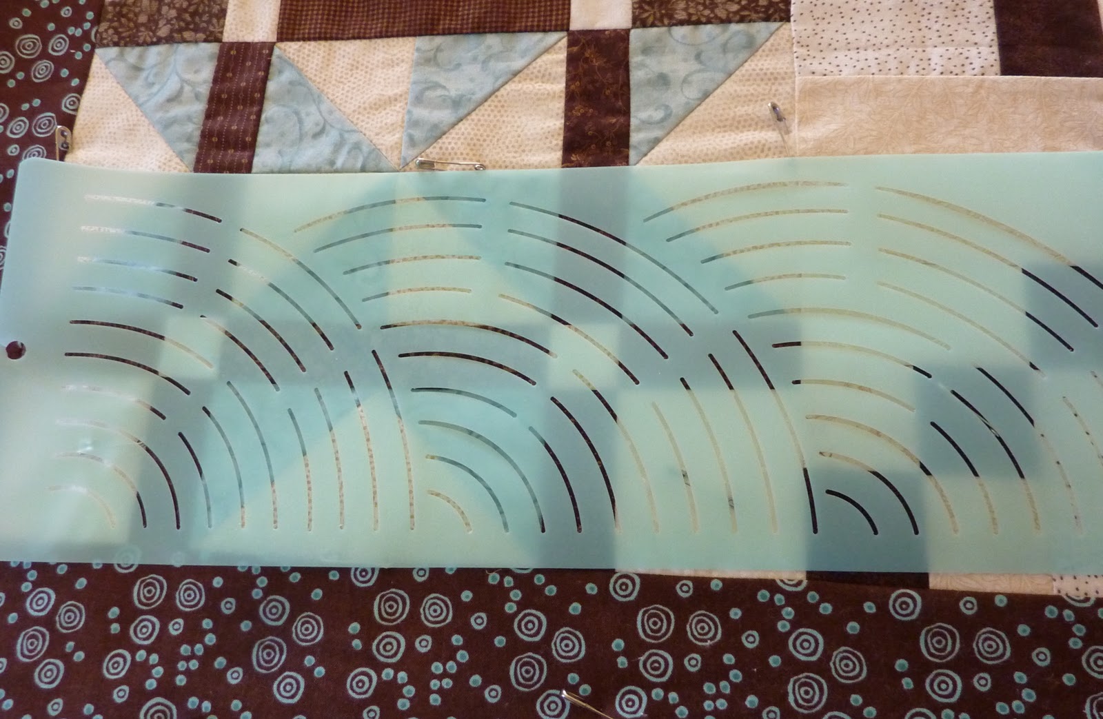 So then I got to thinking that hand quilting fans would be much easier and I even got out a marking stencil that Julie sent me a while ago to see if that could entice me to hand quilt. But I know it will take me 20 years to finish and I already have a hand quilting project on the go that I have been working on for more than 10 years, so I put the stencil away again.