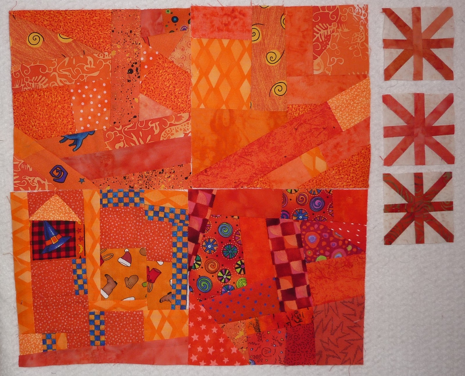 I pulled out my orange scraps and made a few crumb blocks for my rainbow quilt (you can see purple here, and green here). I especially like the block with the witches hat and the Santa hat in the same block! I also sewed up a couple of tiny asterisks, which I am loving.