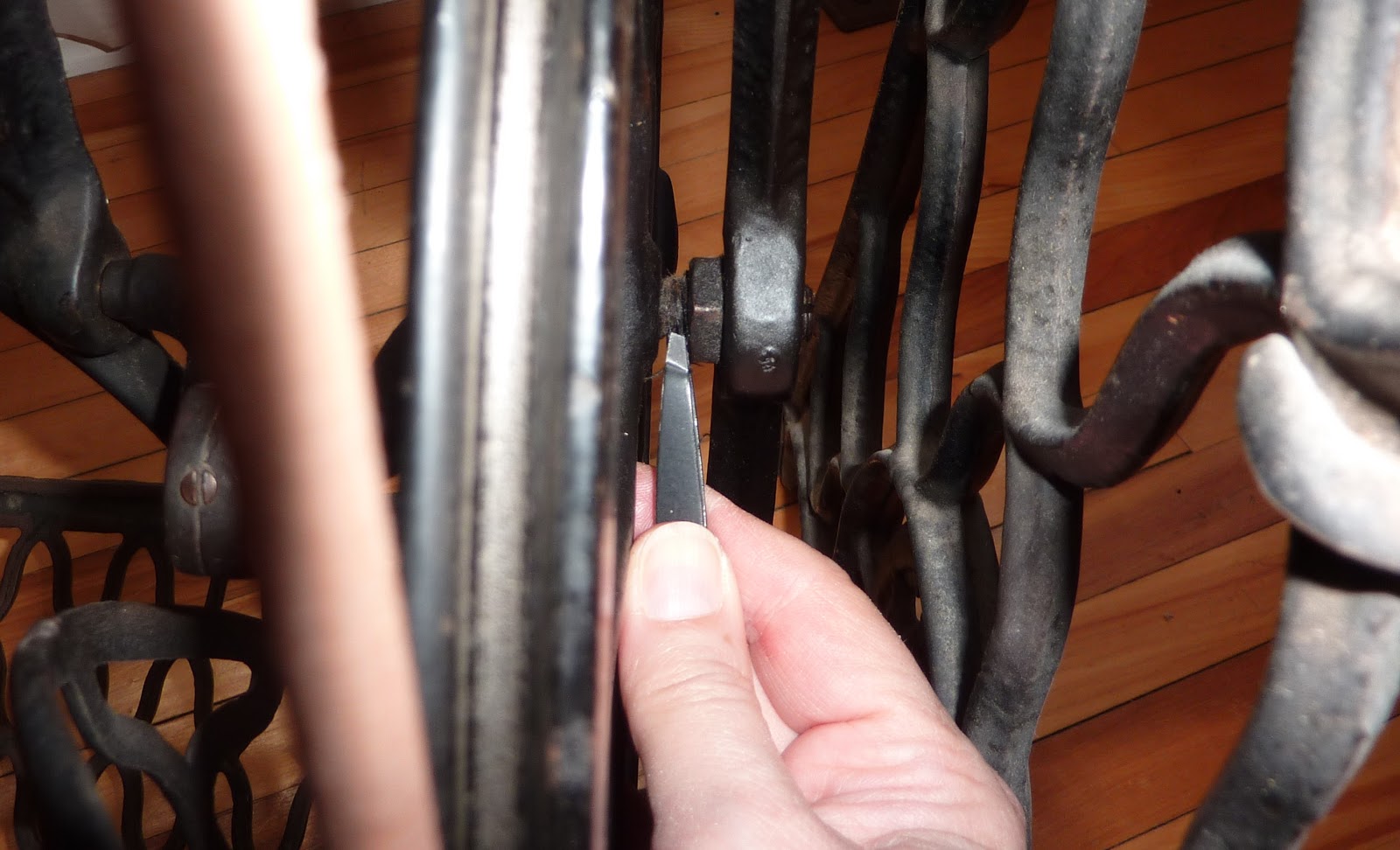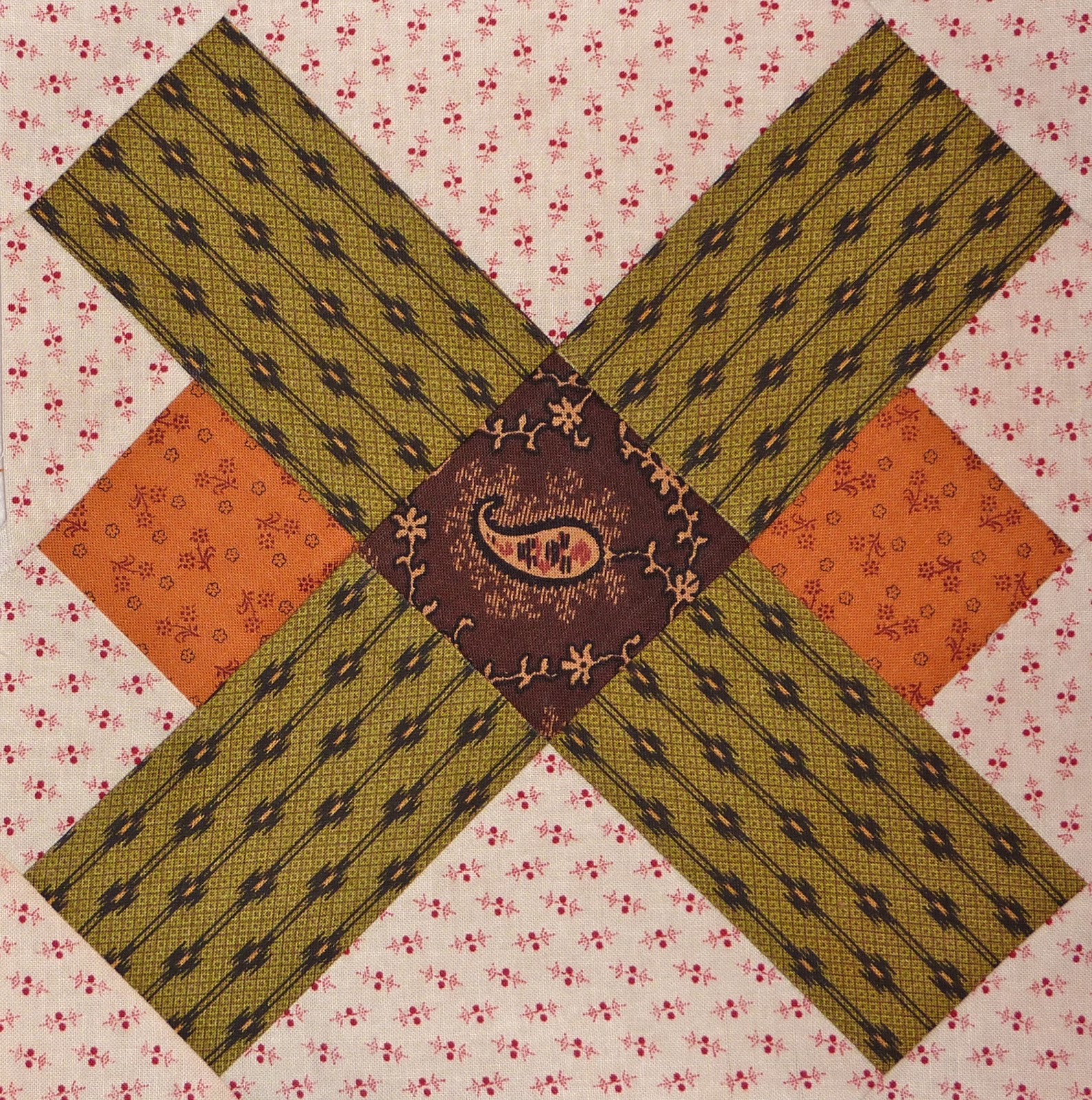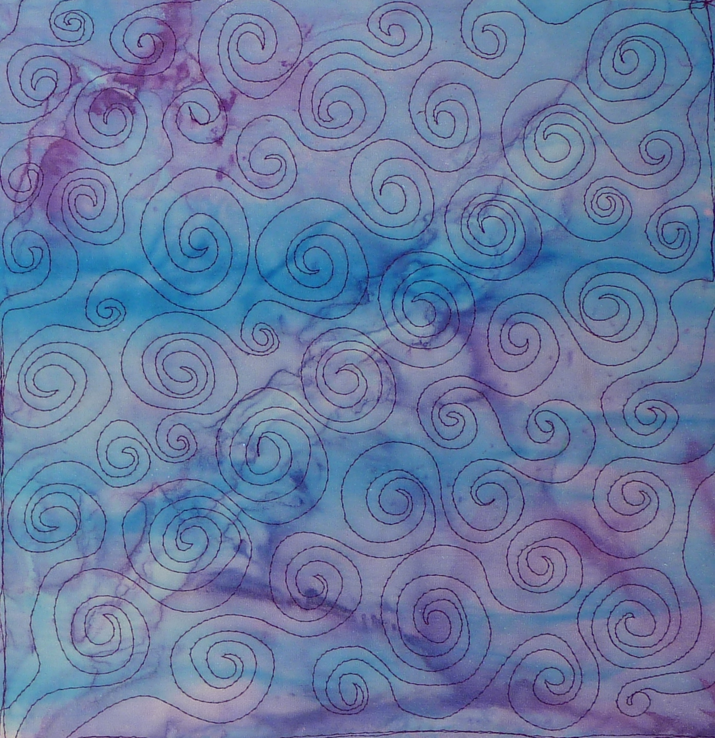 But on the fabric, I tried to stitch a straight line of spirals on the diagonal of the block, and then swirled out! You can see at the top of the line, I forgot that my plan was to swirl in a line and made a couple of little swirls to the right, but I got right back in line!