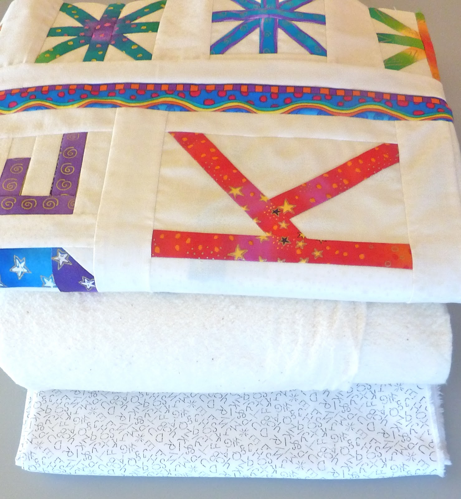 The backing of the quilt is a plain white fabric with letters on it.