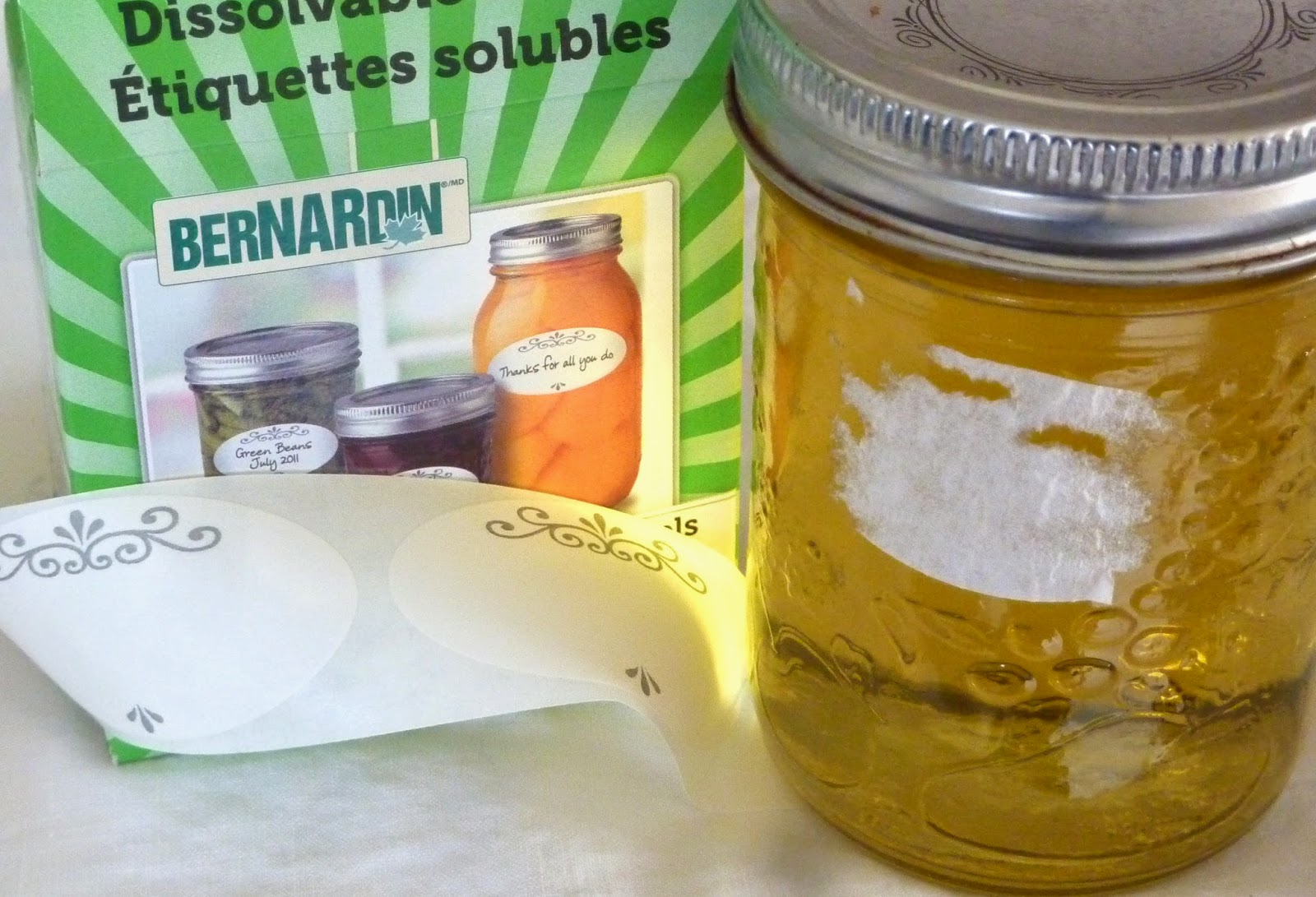 I love the Bernardin dissolvable labels. See the leftover label from last year that I just couldn't scrape off? That doesn't happen with these labels - they wash right away.