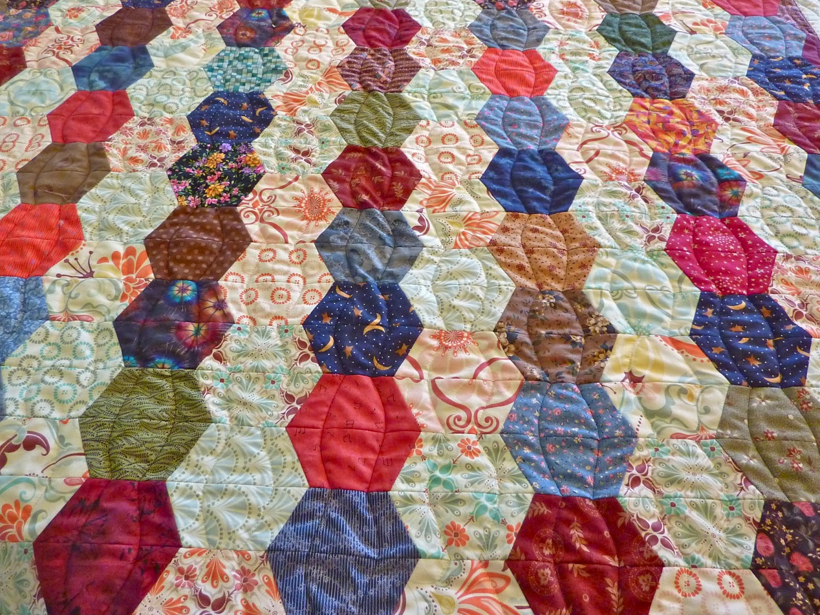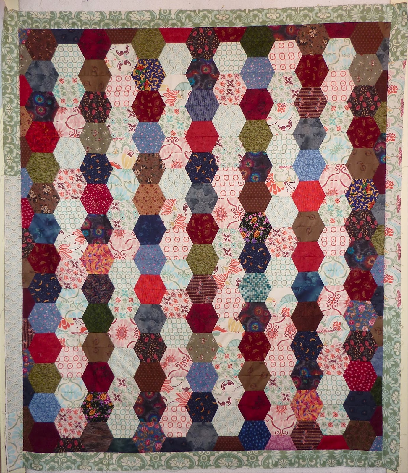 This is a quintessential scrap quilt which has some newer light scraps (Fandango scraps) to perk up the old ones (ancient scraps). This quilt was 4 years in the making and actually includes some of my oldest fabrics. It is a half hexie pattern inspired by Jamie's tutorial.
