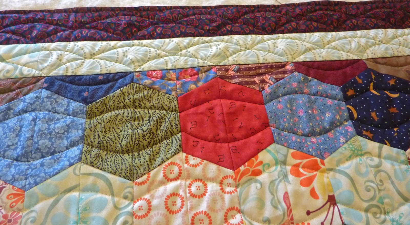 I quilted vertical scallopy free motion lines roughly following the hexagons. It was easy to do, but I see places where I could have tried harder to be more consistent with the shape - perhaps if I was concentrating more and singing less (to the newly released album by Factory City!)