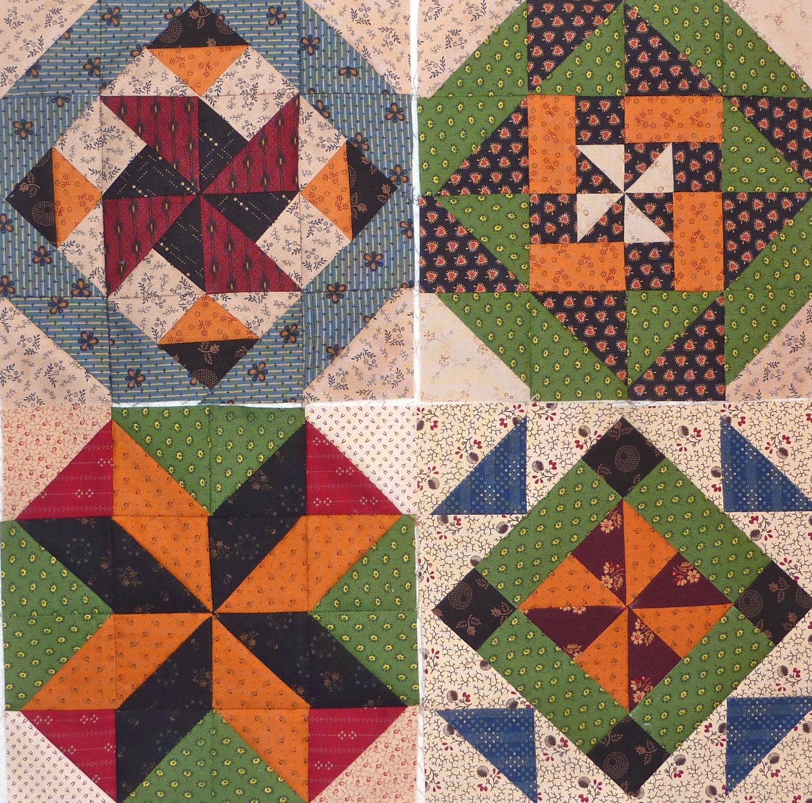 The fourth block is my favorite so far (bottom right). It was fun to sew and although it had unusual cutting measurements (1/16" of an inch?) my block came out to the right size!