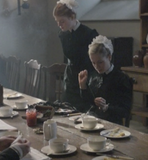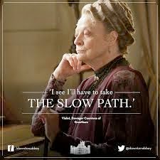 The upstairs folks are embroidering, and the downstairs folks (the staff) are mending. My favorite character is the Dowager Countess, and although I have never seen her stitching, she does recommend slowing down!