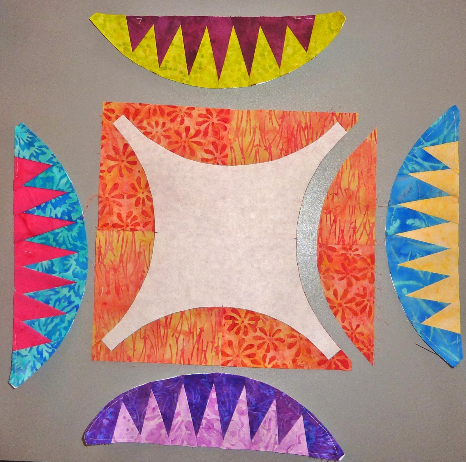 Now I am smitten with the scraps from the sides of the IOP blocks which are cut off before sewing the curved seams to attach the arcs.