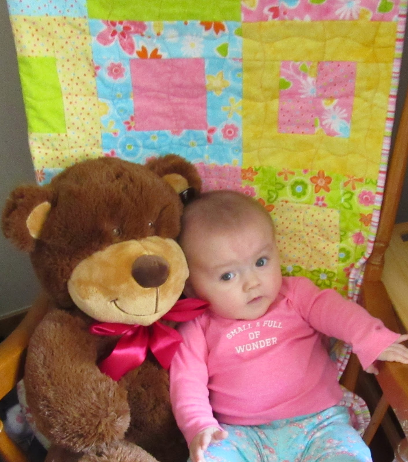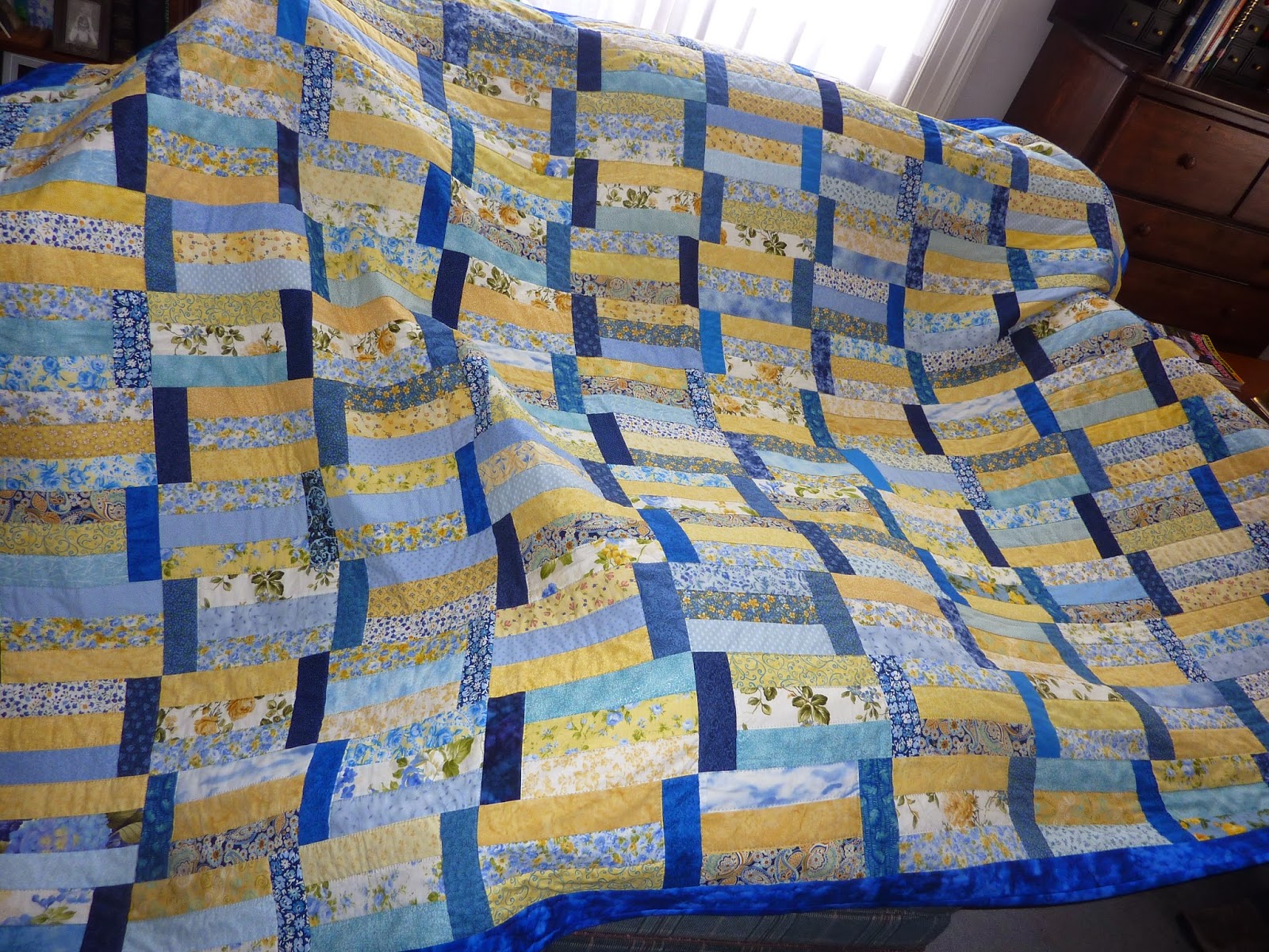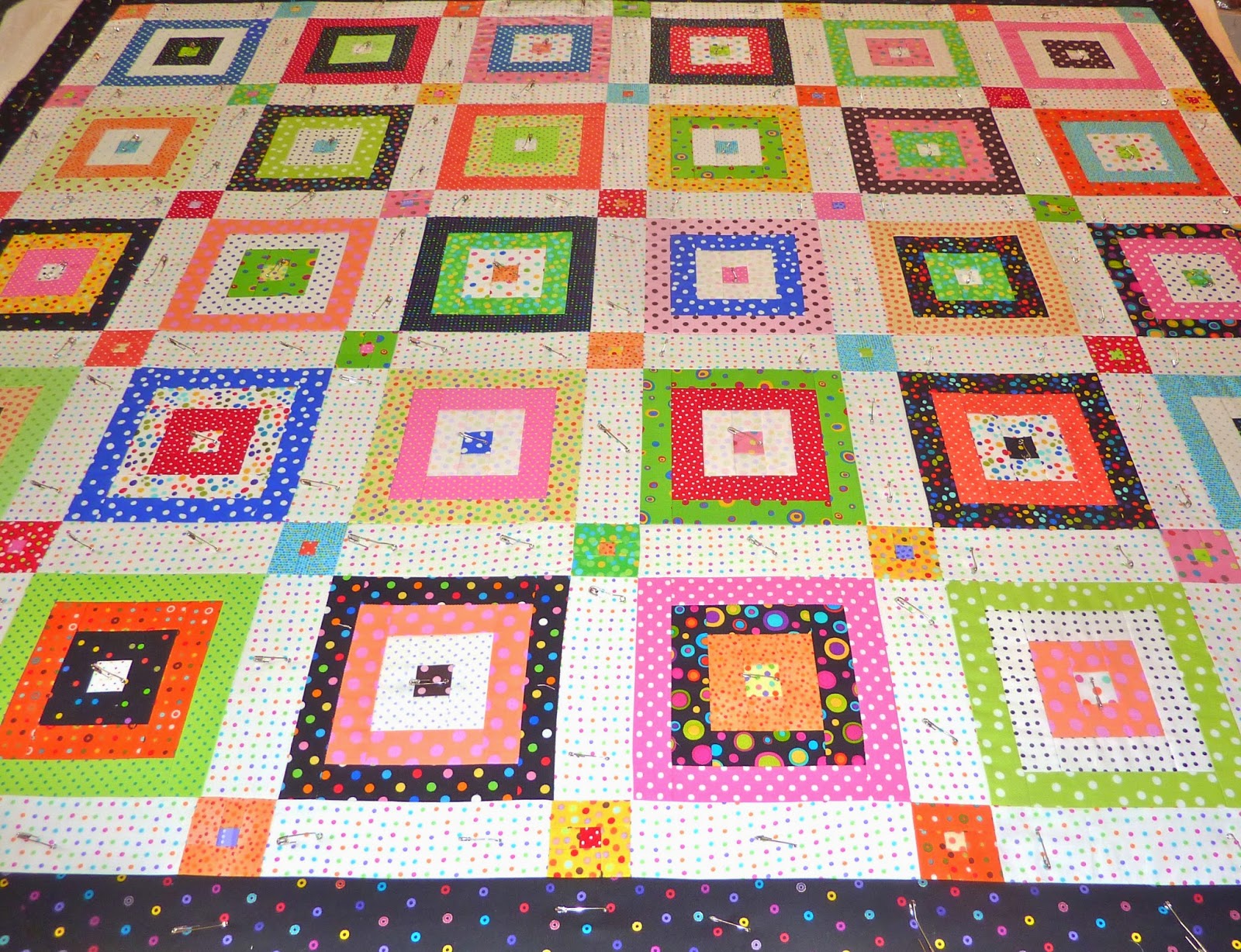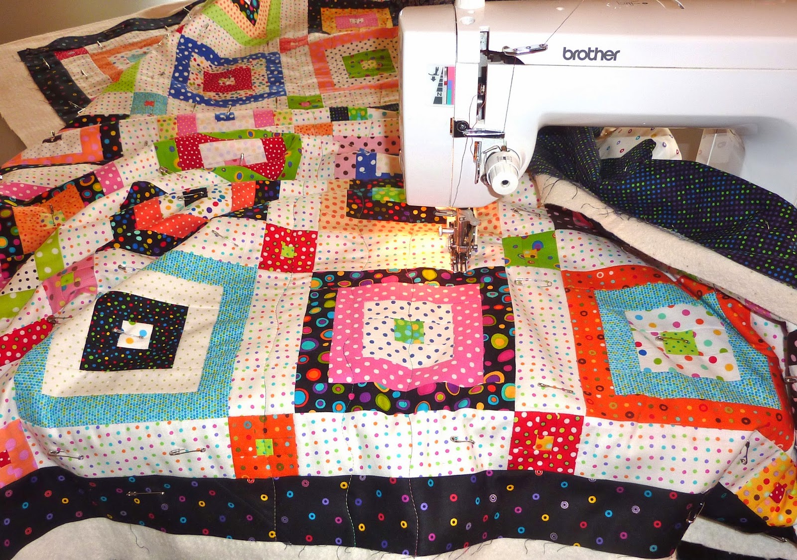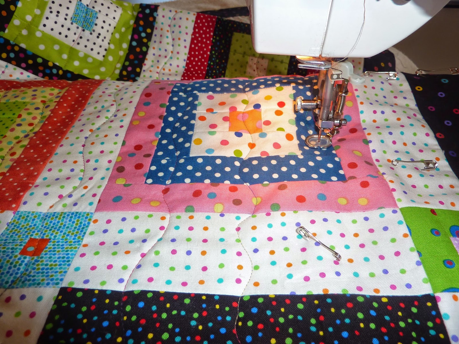 This is the backing of the quilt - one big polka dot log cabin block. Can you see the vertical wavy line quilting?