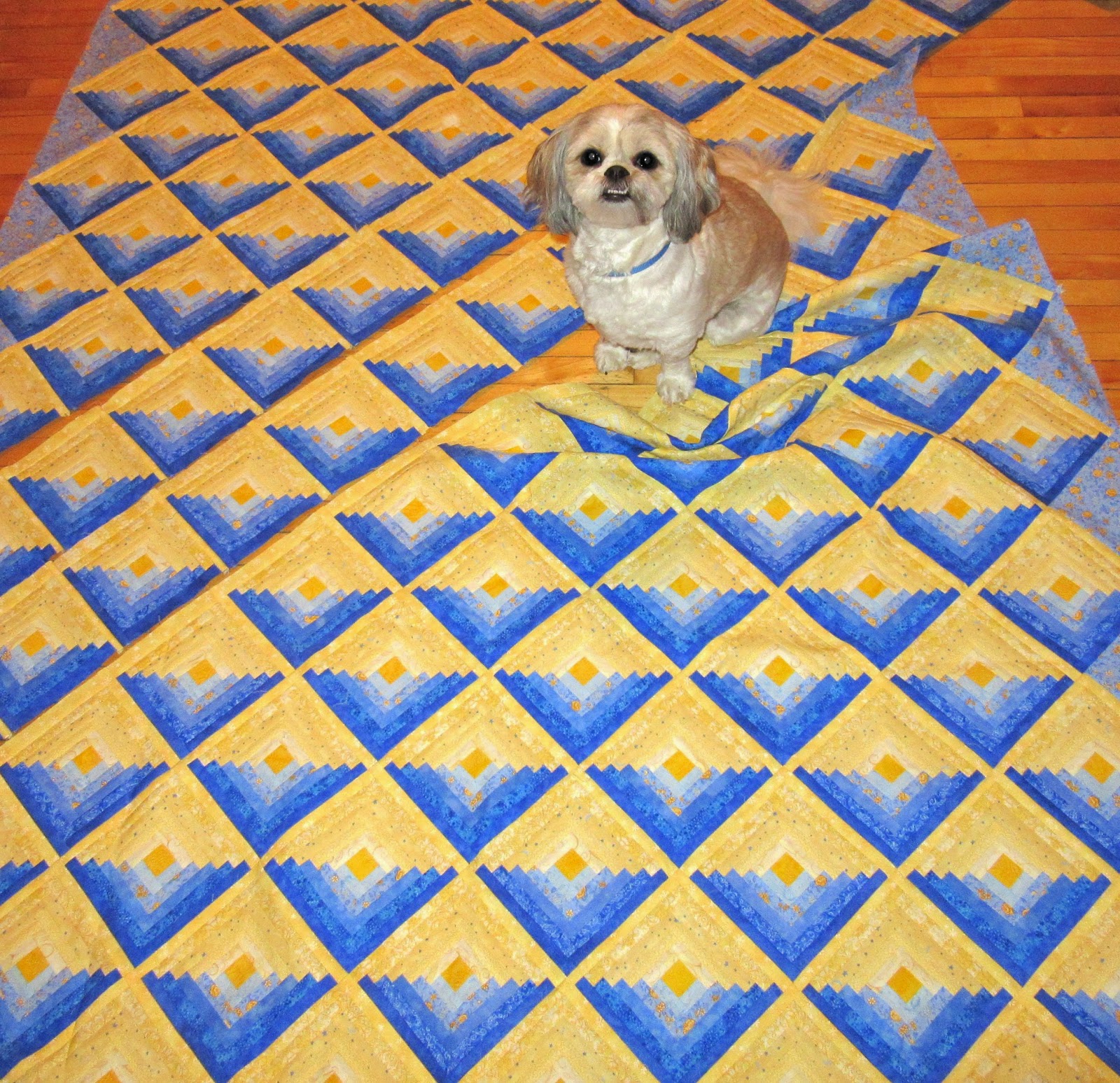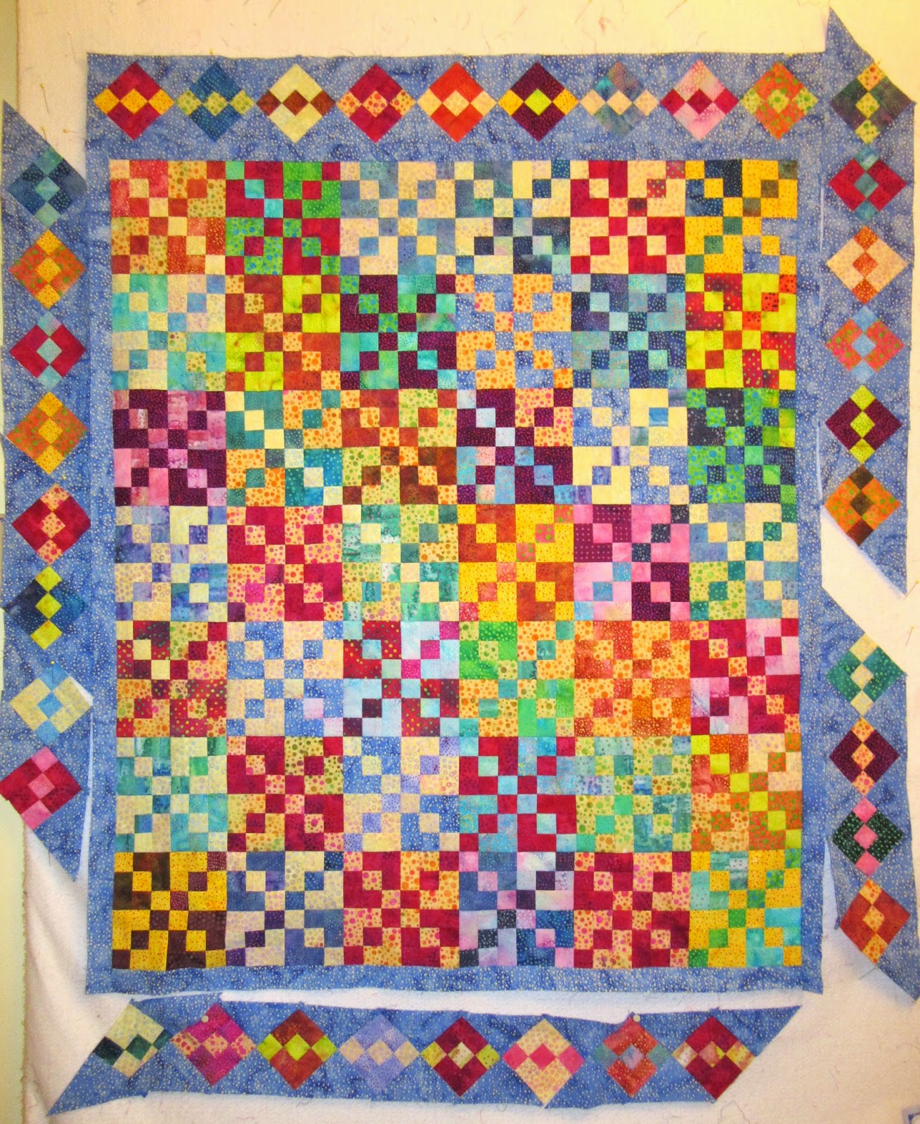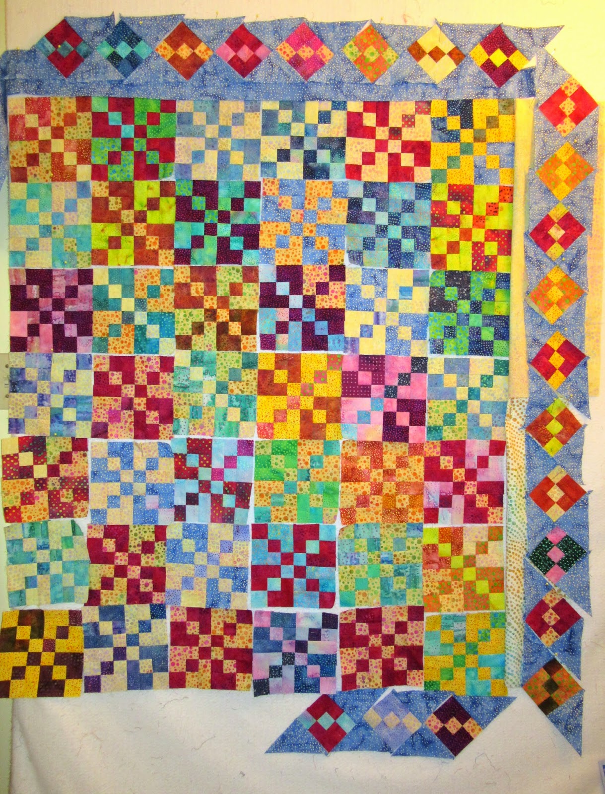 This darn UFO is almost a quilt top. It was a good effort but is taking so long in the designing stage. I added a 1.5" blue border, and then put the extra block parts on point. I didn't have enough blocks to complete the border it wanted, and I am still scrounging through the scraps trying to stretch them to make enough blocks.