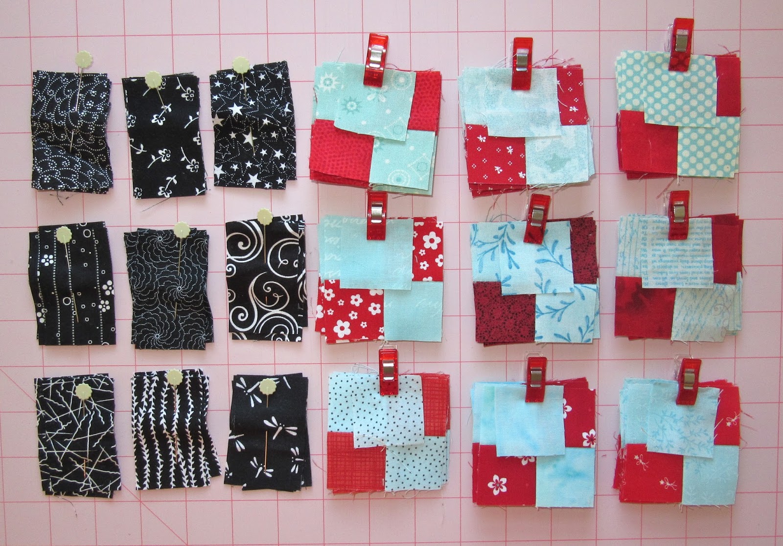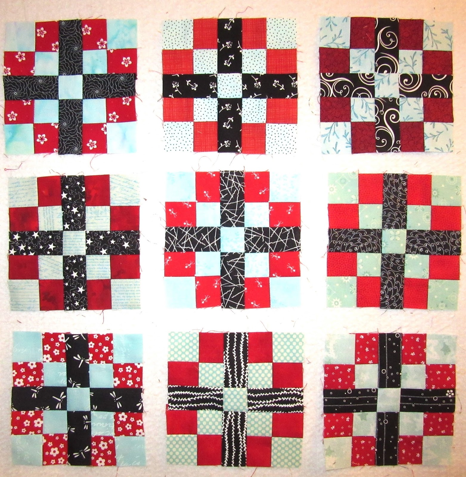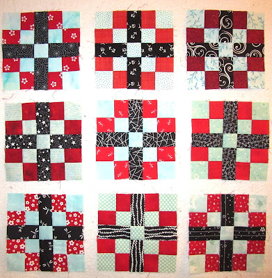 I can now be found in my sewing room, trying to recover from the trauma of hitting myself over the head with this technological shovel! I am sewing little pieces together for Lori's Country Roads mystery quiltalong. Here are the parts for 9 blocks.