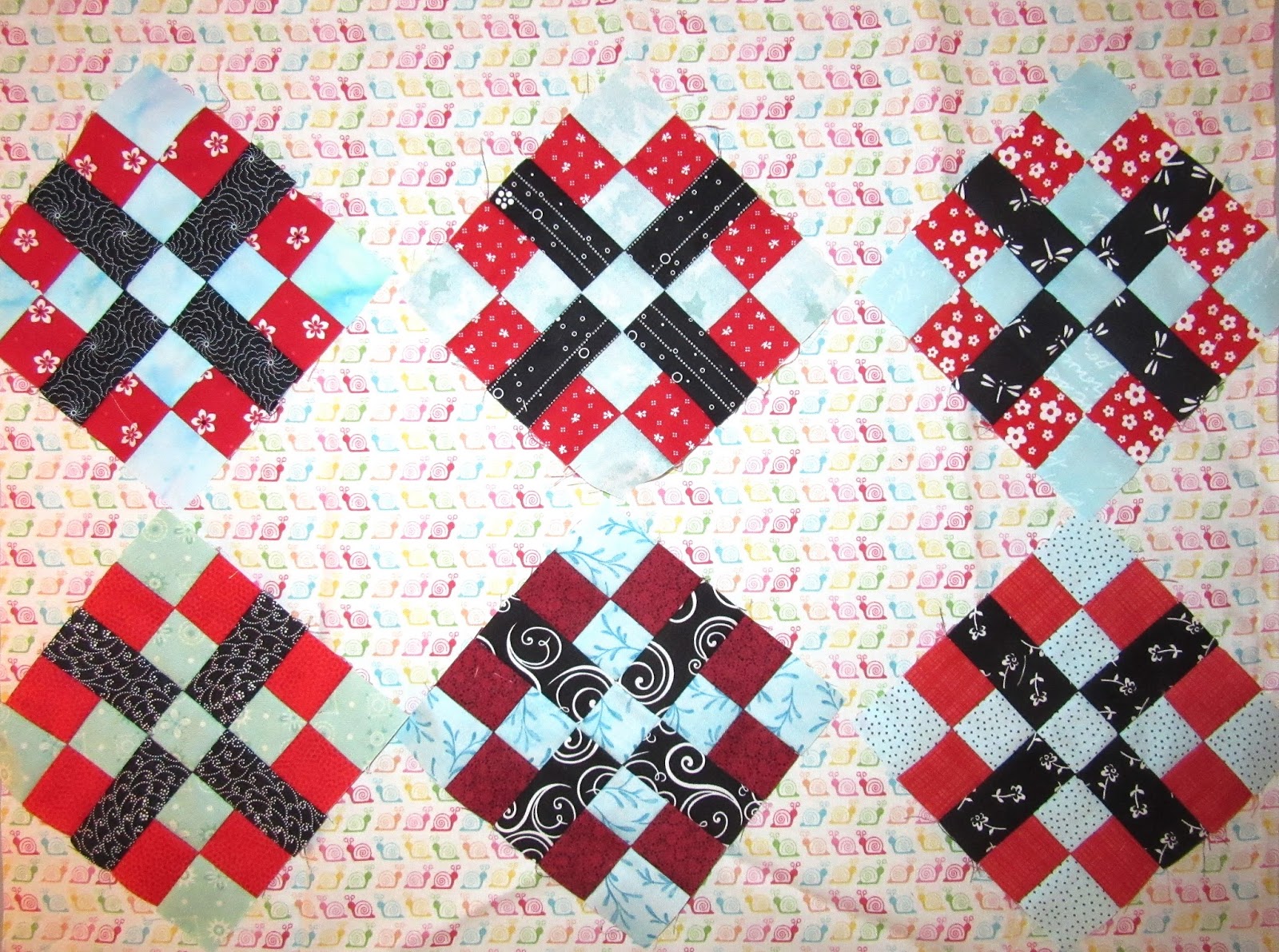 Deciding on the layout was the highlight of making this quilt. There are so many possible options in setting these blocks together. Of course I tried out all of the layouts in Quiltmaker magazine on my design wall to see what would happen when each block was twisted, turned, and set differently beside it's neighbour.