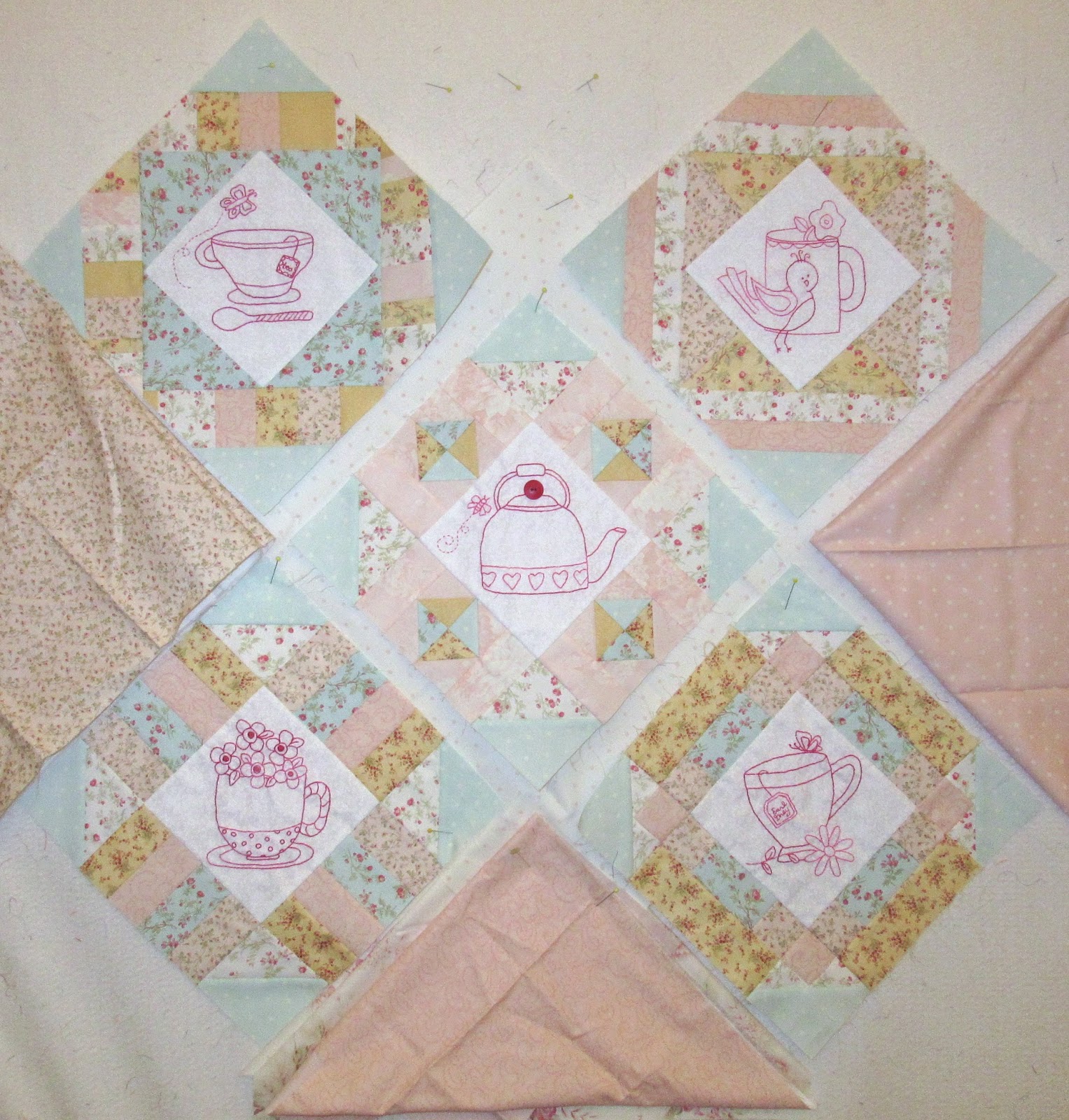 Today I'll be working on my Cozy Afternoon quilt with the Sew Along hosted by Jacquelynn. All my blocks are made and I'm working on the layout decisions for the quilt. Jacquelynne's pattern makes a quilt about 66" square and I wanted a smaller version. So I am changing the layout using only the embroidery blocks and some outside setting triangles.