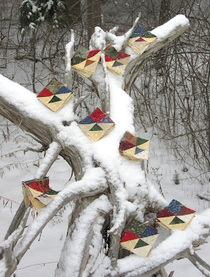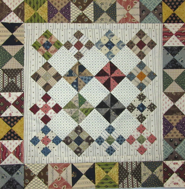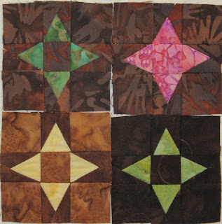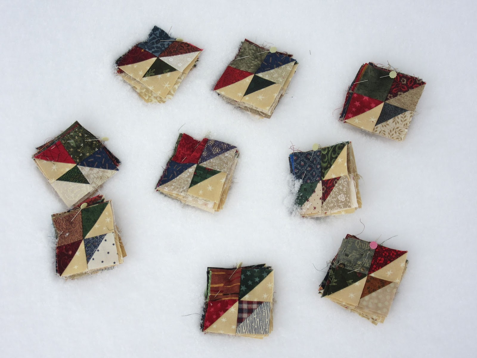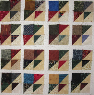 Here are my 28 hourglass blocks from last week's step. They aren't as scrappy as I would like because I used the traditional method of making QSTs (start with squares, draw a diagonal line and sew both sides of the line, etc.) which makes two identical blocks.