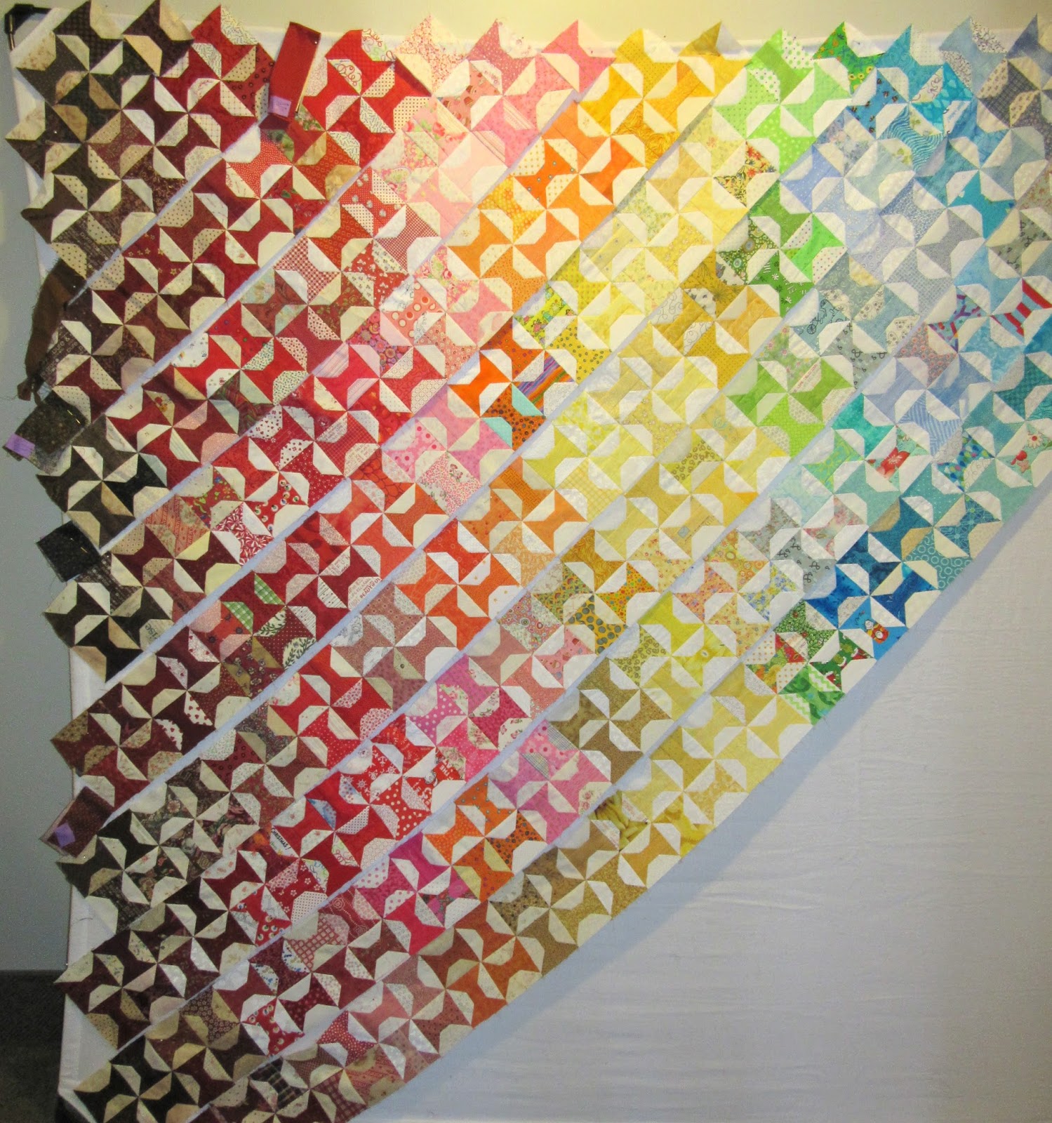 I have finally started putting together my spool quilt. The spool block was Bonnie Hunter's leader/ender challenge in 2012 (click here for the pattern) and I finally started making them in 2013. They became my primary leader/ender rainbow challenge project for a while and made