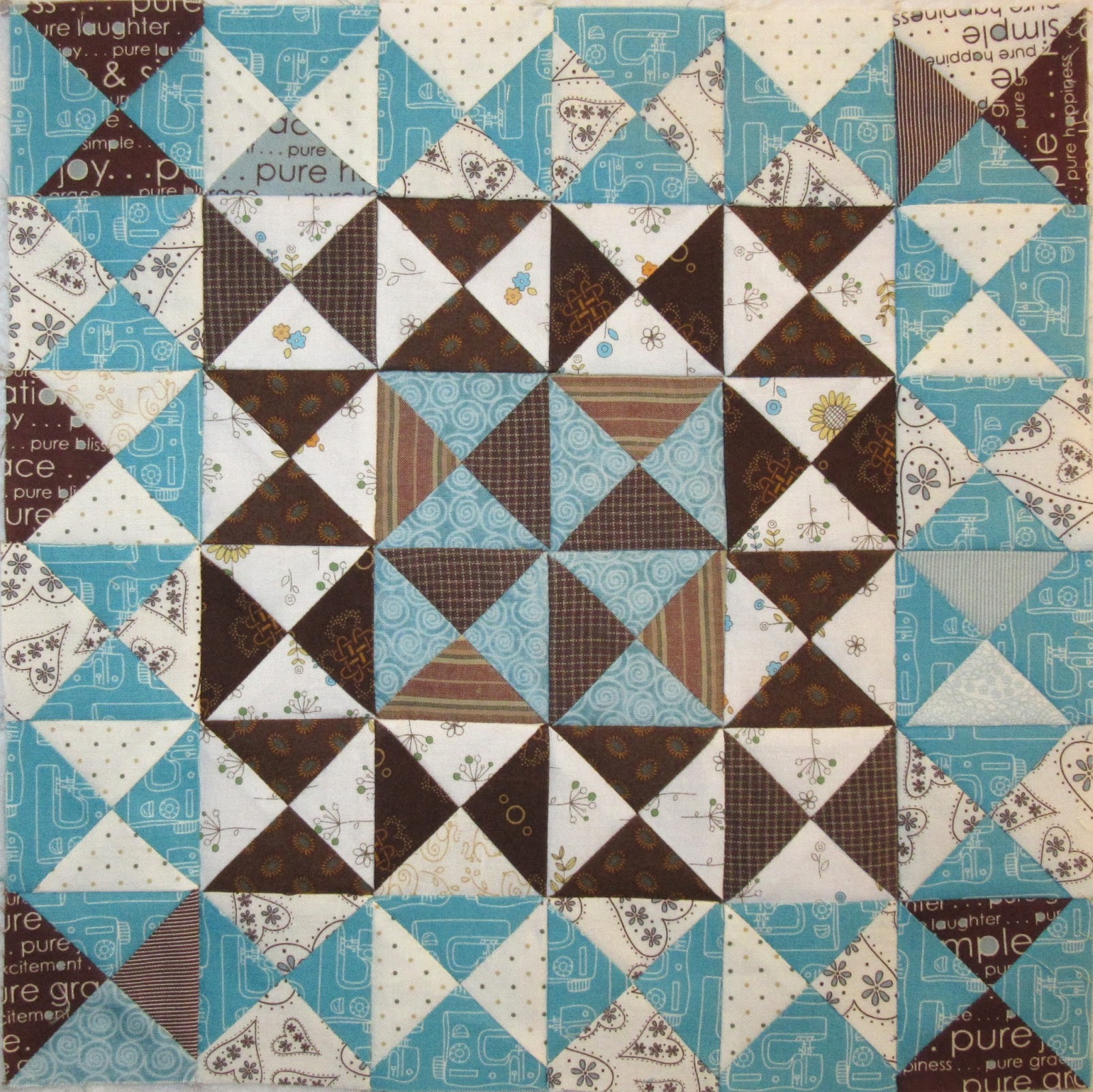 However, when it comes time to sew the block together, it's a concentrated effort. There are a lot of thick seams to match, and lots of points that I don't want to lose in the seams. I sure do love that blue/teal fabric that has sewing machines on it. I don't have much of it left and will sprinkle the remaining scraps in some of the future blocks.