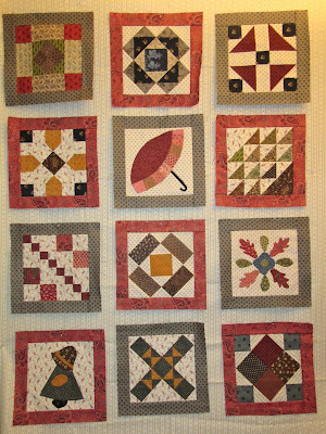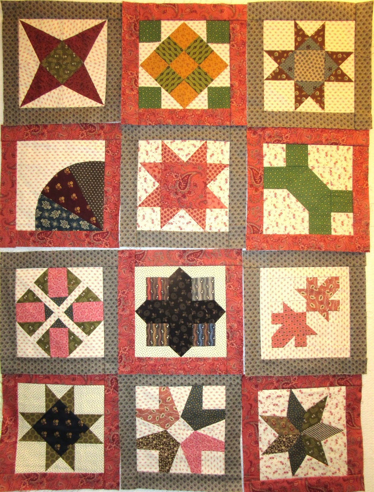 Here are all my blocks together on the design wall. We've finished 9 blocks so far and have 3 more to go to the end of the year. It will be a great sampler quilt! But wow that is a lot of red!