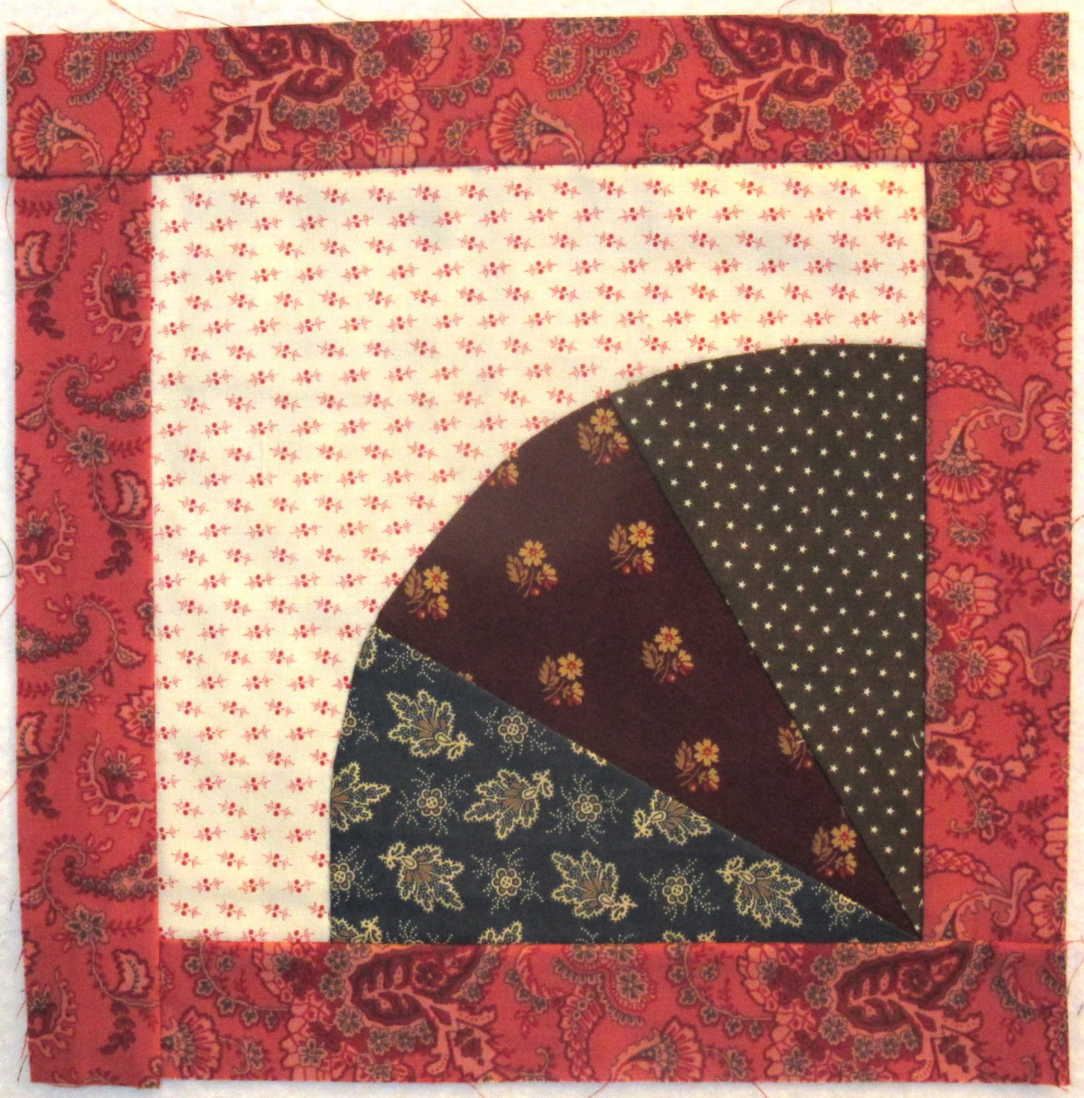 First up this month I made a red "Circle of Squares" block (tutorial here). It's such a fun block to sew and it turned out well with that spotted background fabric from the Wintergraphix II line. I sure wish I had bought more than a FQ of this fabric!