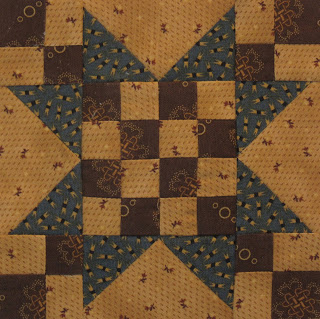 This is block #17 made for my version of the Clarissa quilt. I wanted to include more of the dotted butterscotch fabric in the quilt since it does seem to draw attention to itself when all the blocks are together. The key to dealing with "attention seeking" fabrics is to sprinkle more of them around the quilt.