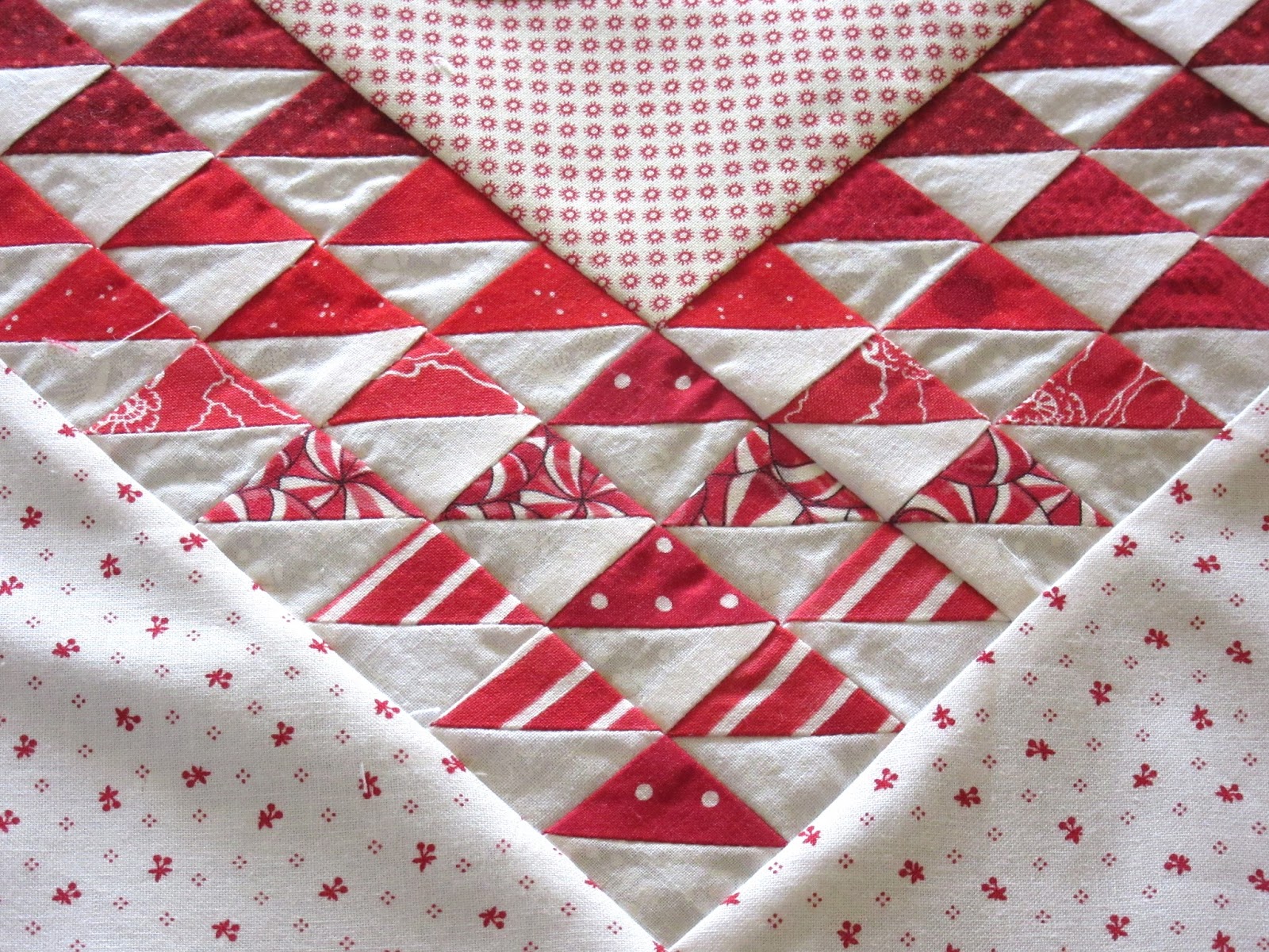 Although it is a 2 colour quilt, it really is a true scrappy quilt with it's huge variety of red and white fabrics. I was determined to not buy more fabric to finish it, so I had to substitute another red for some of the block sashings. Many of the sashings are pieced from scraps. And the inside light sashing is a different size from the border sashing because I was running out of that yardage too. It was a huge logic/math puzzle (not my strength) which makes this seem like a bigger accomplishment to me than usual!