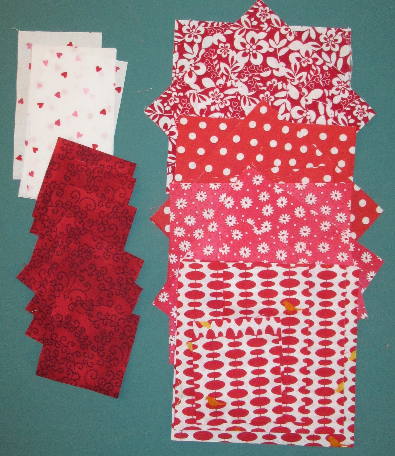 When I cut all the pieces I thought it would be a good combo, but perhaps there is not enough contrast between the reds? Or maybe the prints are too busy? Actually it looks better on the computer screen than in real life :)