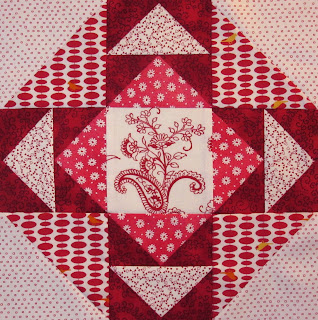 This month's designer is Amy Friend and this is my red and white version of her "cups and saucers" block pattern. It was very easy to sew and I really how my fussy cut centre square looks!