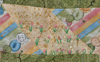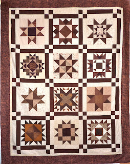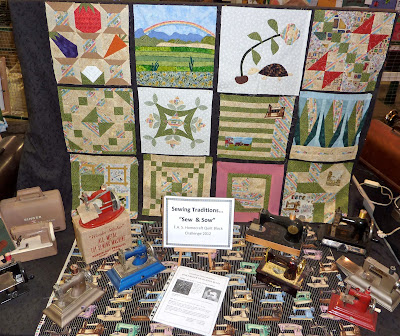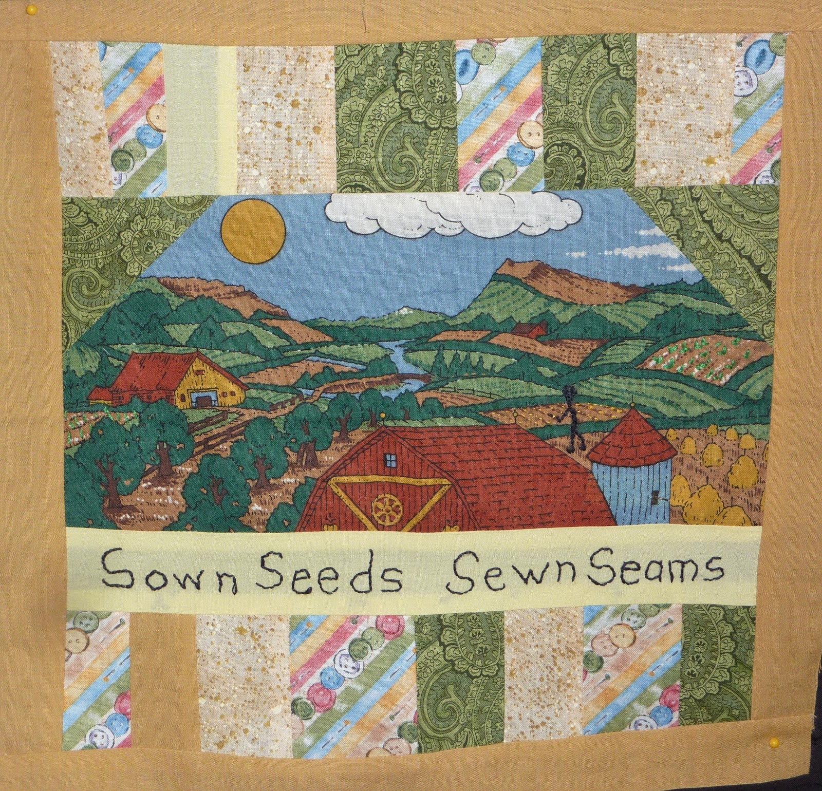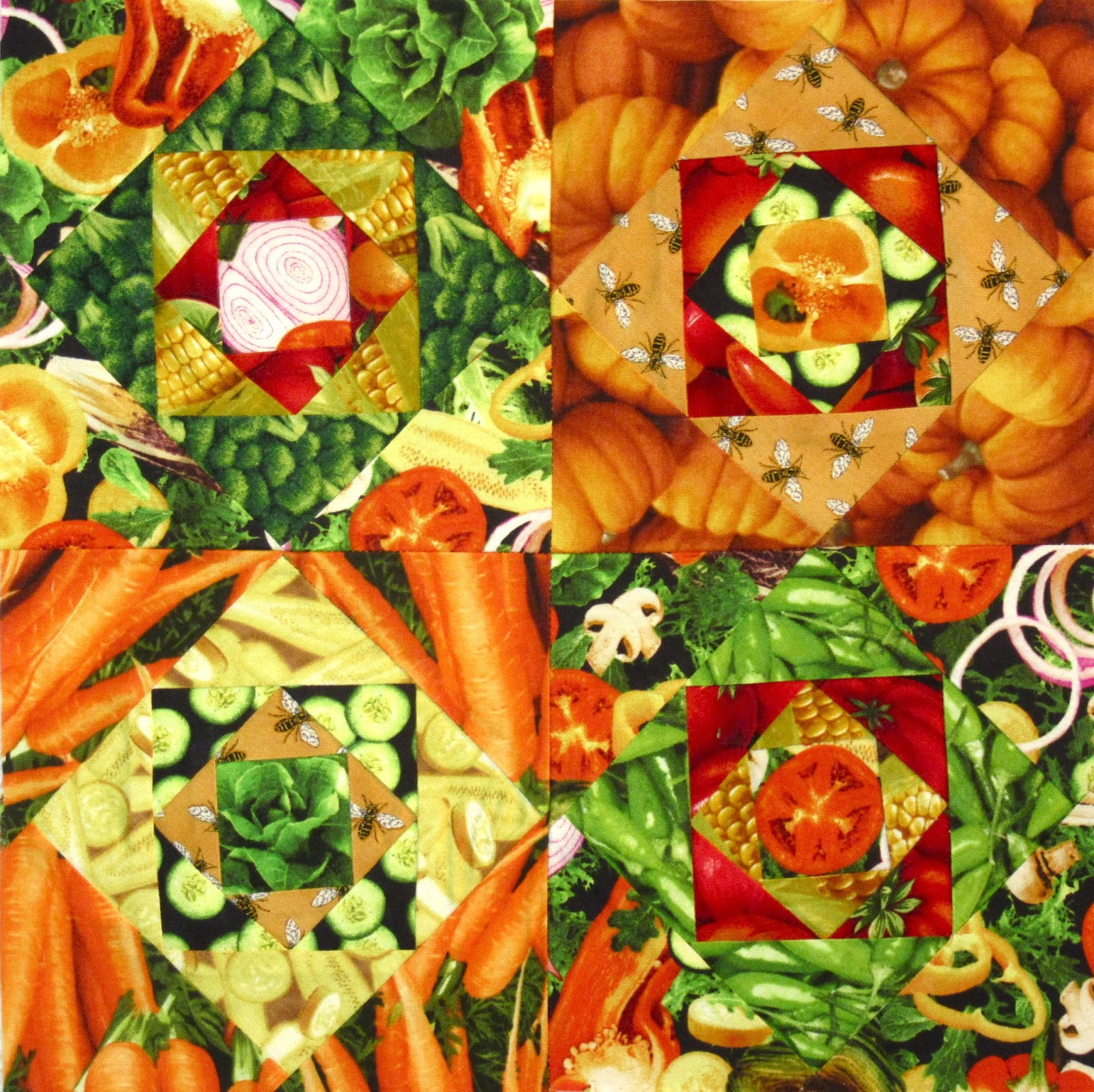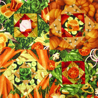 The challenge was to create enough contrast in the block when using only very busy vegetable prints. I tried to create contrast by carefully considering the scale and value of the prints. Still... it's very chaotic looking. I'm telling myself that it's just like a healthy vegetable garden should be! Fair submissions are on friday morning and I'm delighted to not be finishing at the last minute - you quilters just know how we are!