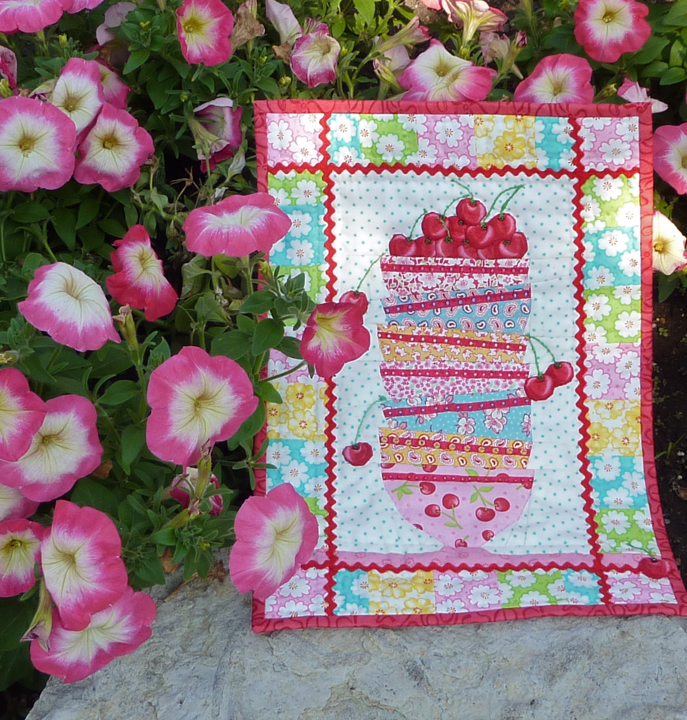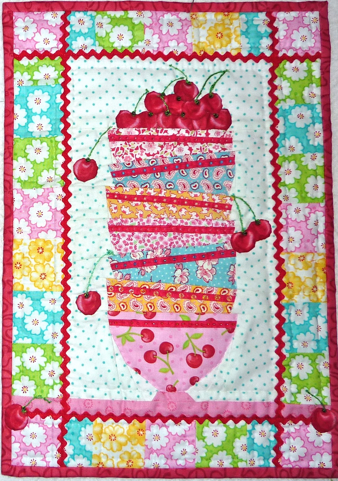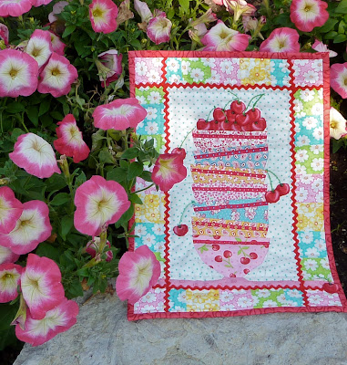 I had a great time piecing the bowls (that was my favorite part) and stacked them 7 high. Then I appliqued the cherries which I fussy cut from "Oh Cherry" fabric and embroidered the stems (no, that was my favorite part).