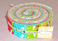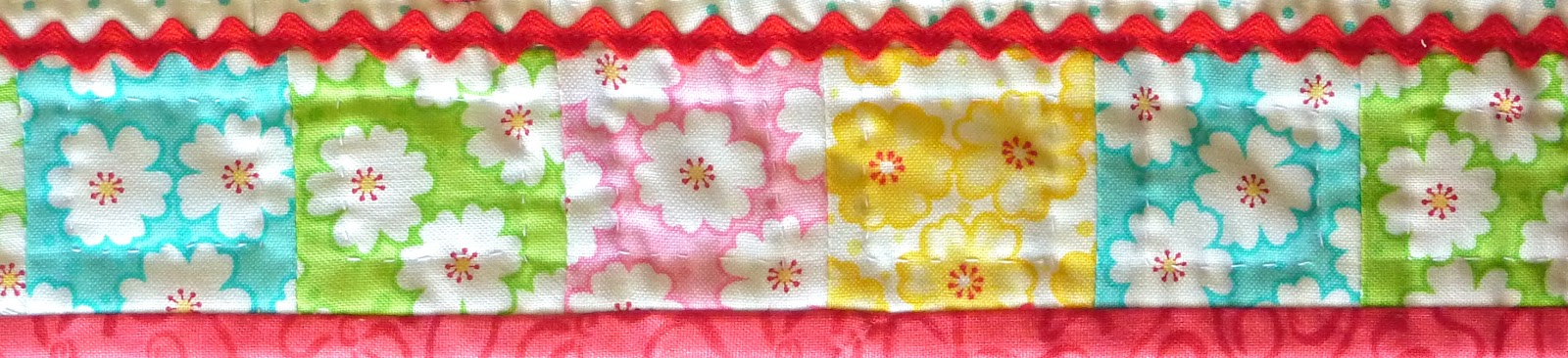I sewed together small scraps from the flower fabrics in the "Oh Cherry" line, and attached a tiny red rickrack at the beginning of the border.