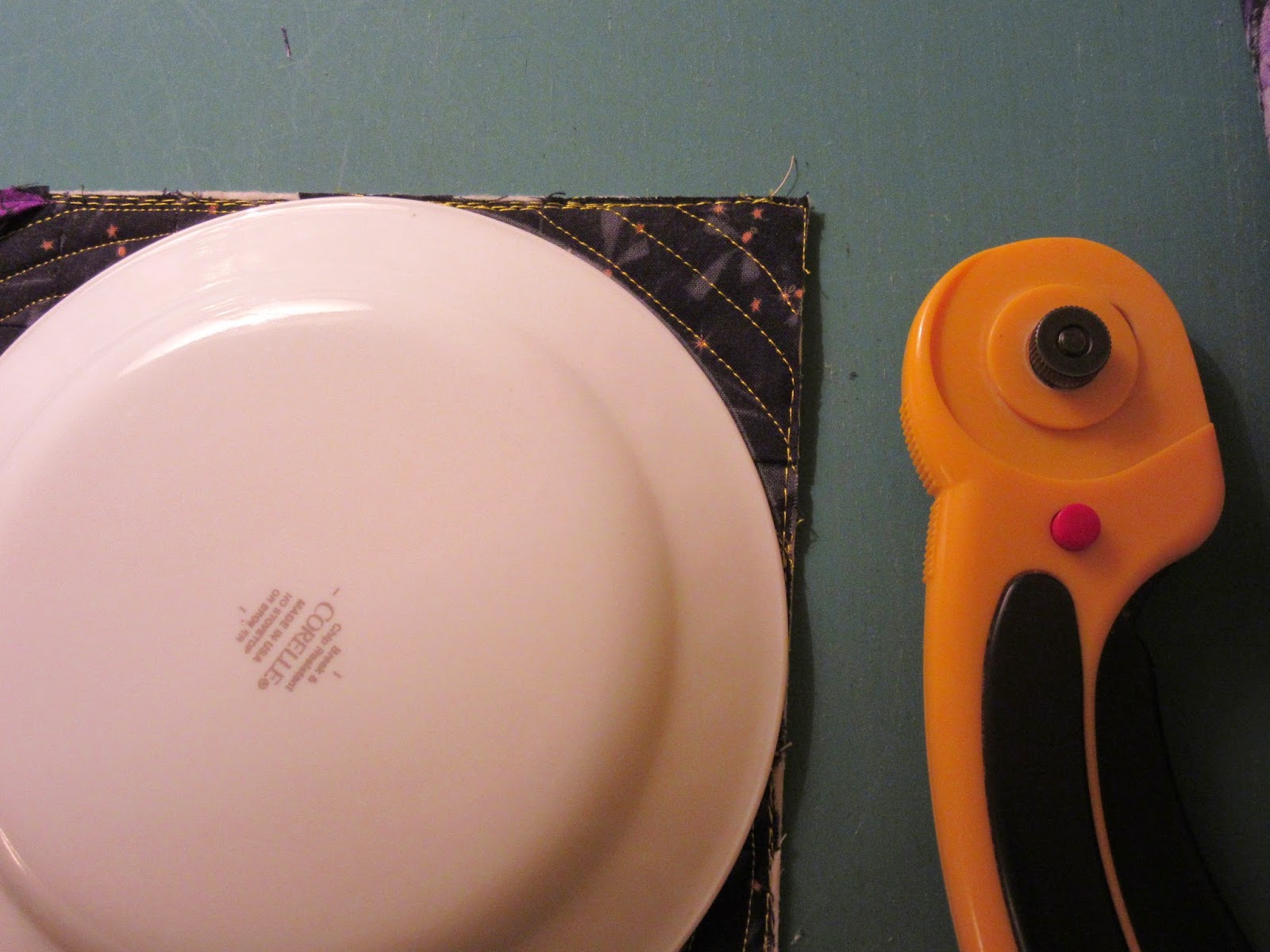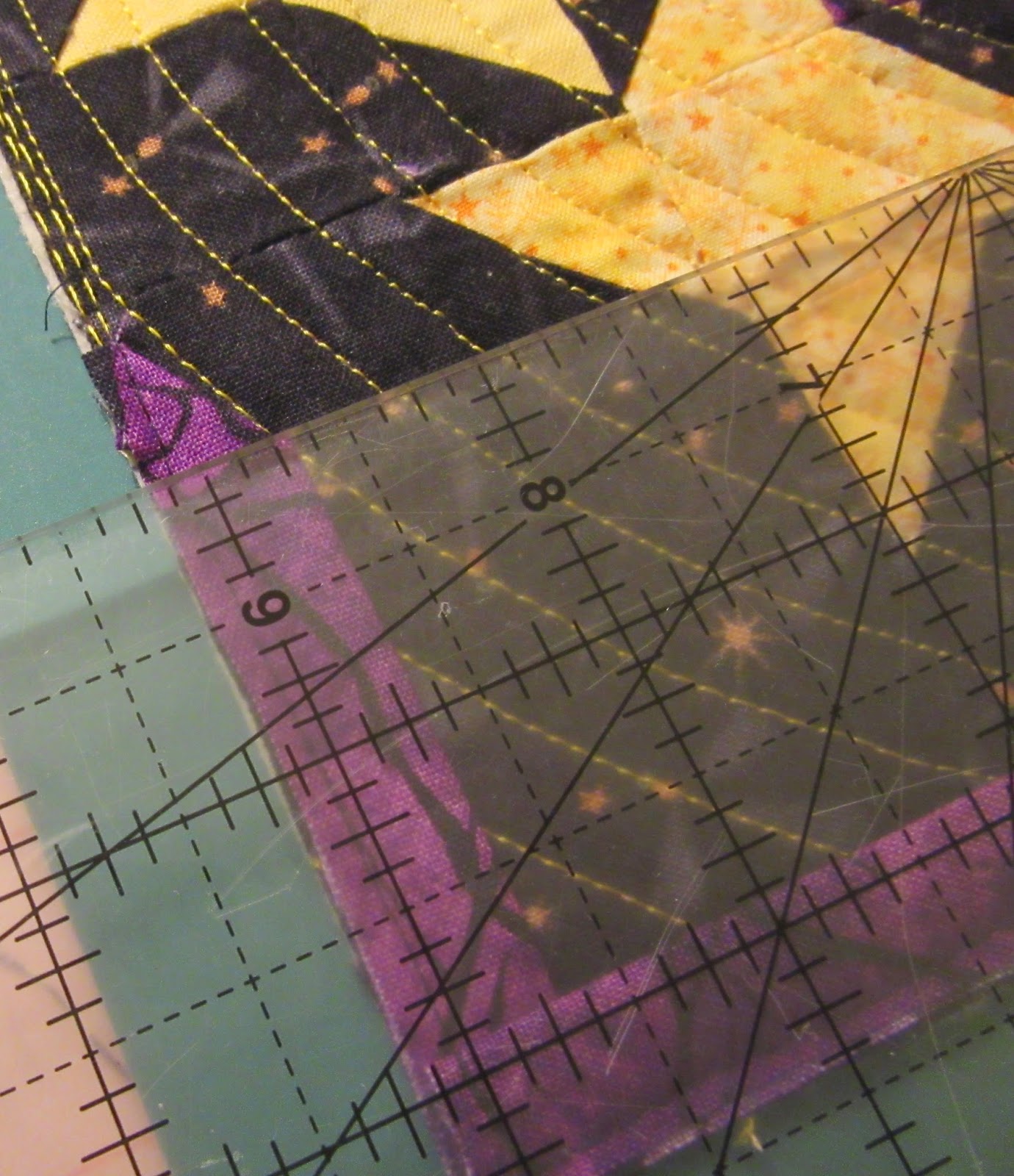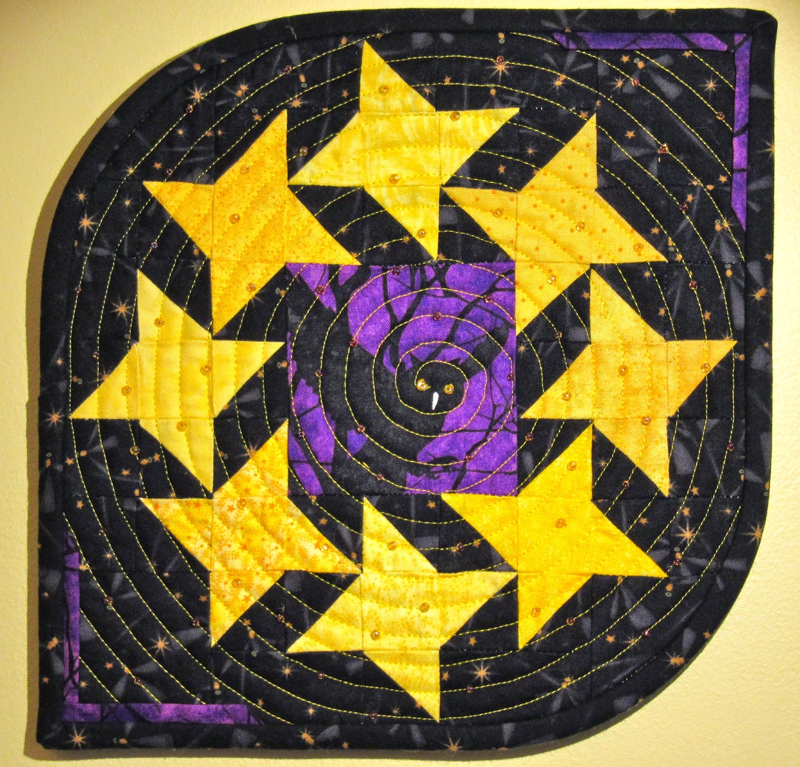 Even sewing the strange binding angles worked out okay. I made a two fabric binding with a predominantly white starry fabric on the left and a bold black and white stripe on the right.