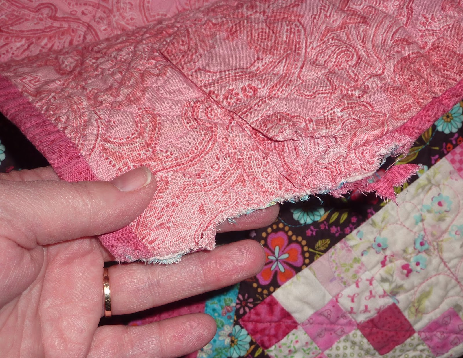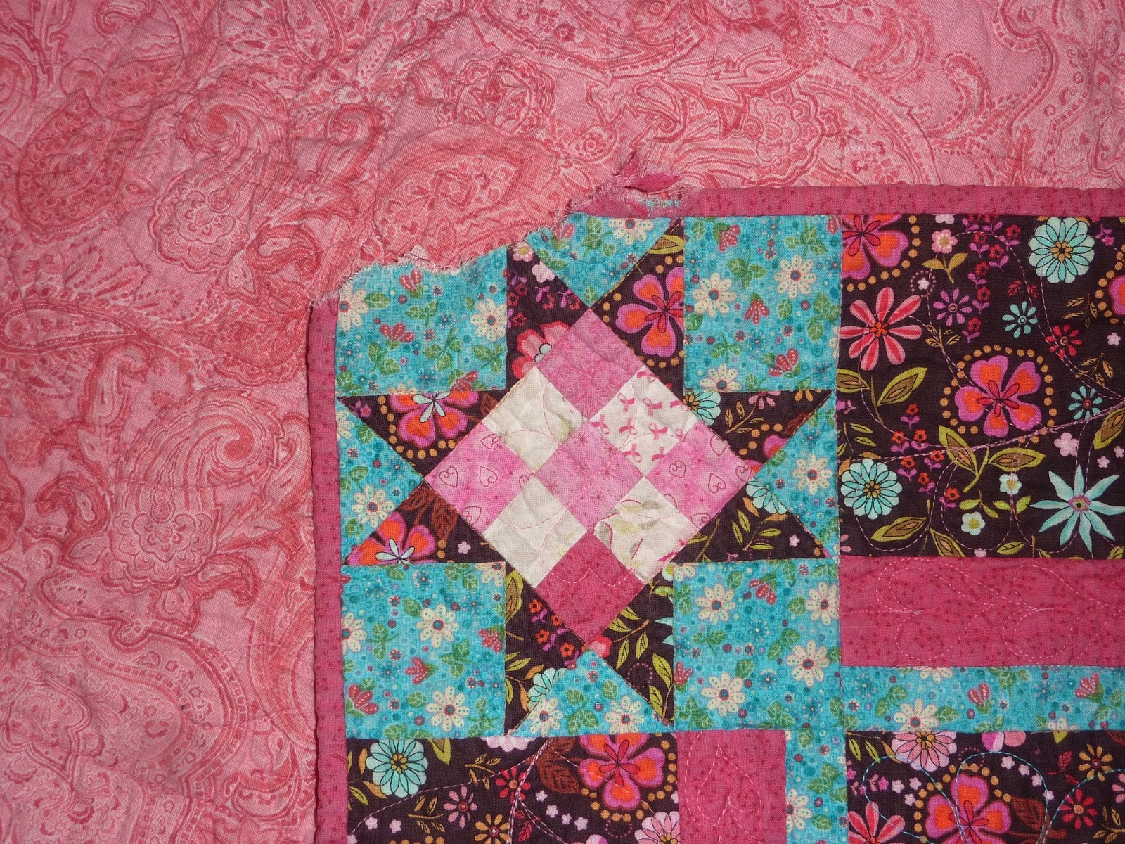 So instead of 2 borders (teal and then brown floral) I cut the teal in half to have enough to go all the way around the quilt, and then had to add a 3rd border of raspberry to make up the measurement...UGH! Here is a photo of my original border idea.