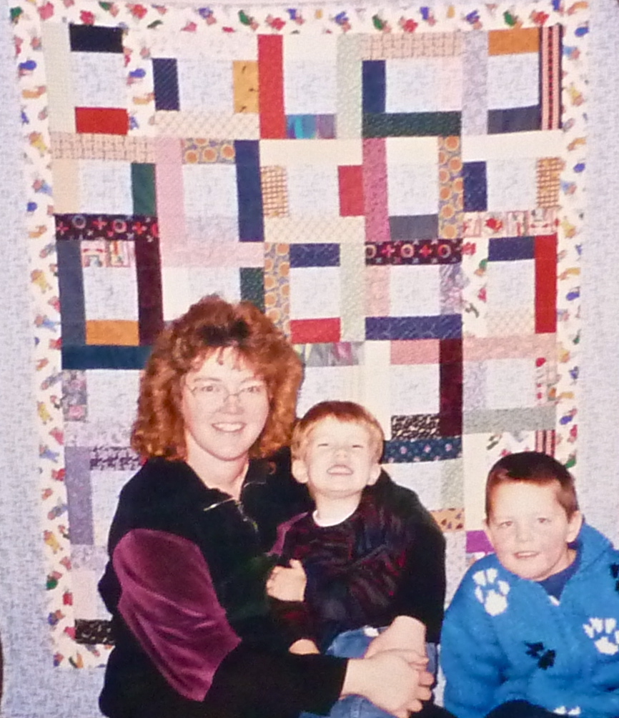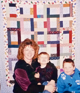 Here is a bad old photo of me with my nephew and son. He looks so happy about his quilt! And I look so young in my velour outfit ...and so much a red head (which regretfully, I never was!) LOL