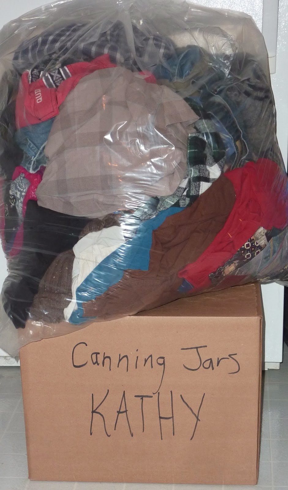This is some of my brother's stuff that came to live with me. My brother's canning jars (he loved to garden and make soups and jam) and of course, some of his clothing. I am going to make quilts for his boys for Christmas.