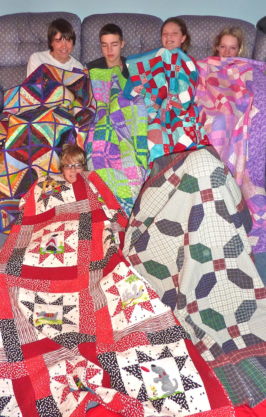 Many of my nieces and nephews were together last weekend for a family celebration, which is the perfect opportunity for a quilt airing. The kids could use sleeping bags for "stay awakes" (we used to call them "sleepovers", but changed the name because not much sleeping goes on!) but it's not nearly as much fun as getting out all the quilts. Pass 'em around and snuggle in...so fun! This photo brings me great comfort and joy!