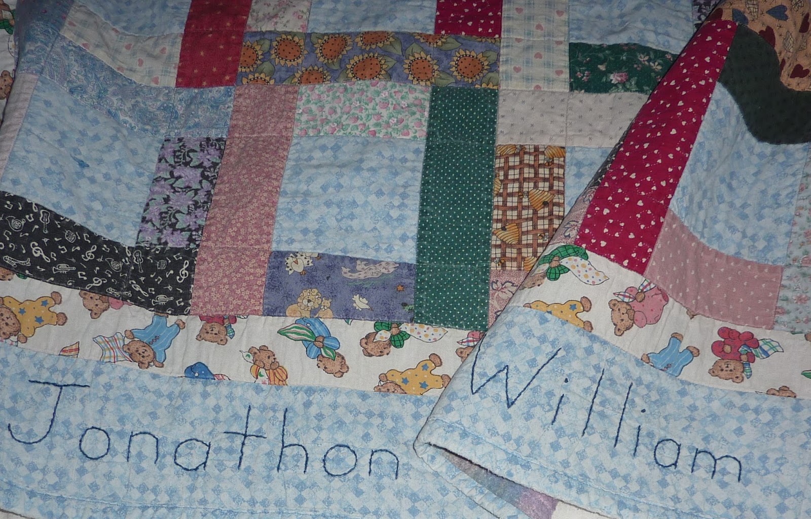 This is a "classic Kathy" quilt...scrappy, fun, personalized and full of love. I was delighted to see that although it is quite faded and the binding is very worn, the hand embroidery is still holding up great! And the memories haven't faded one bit!