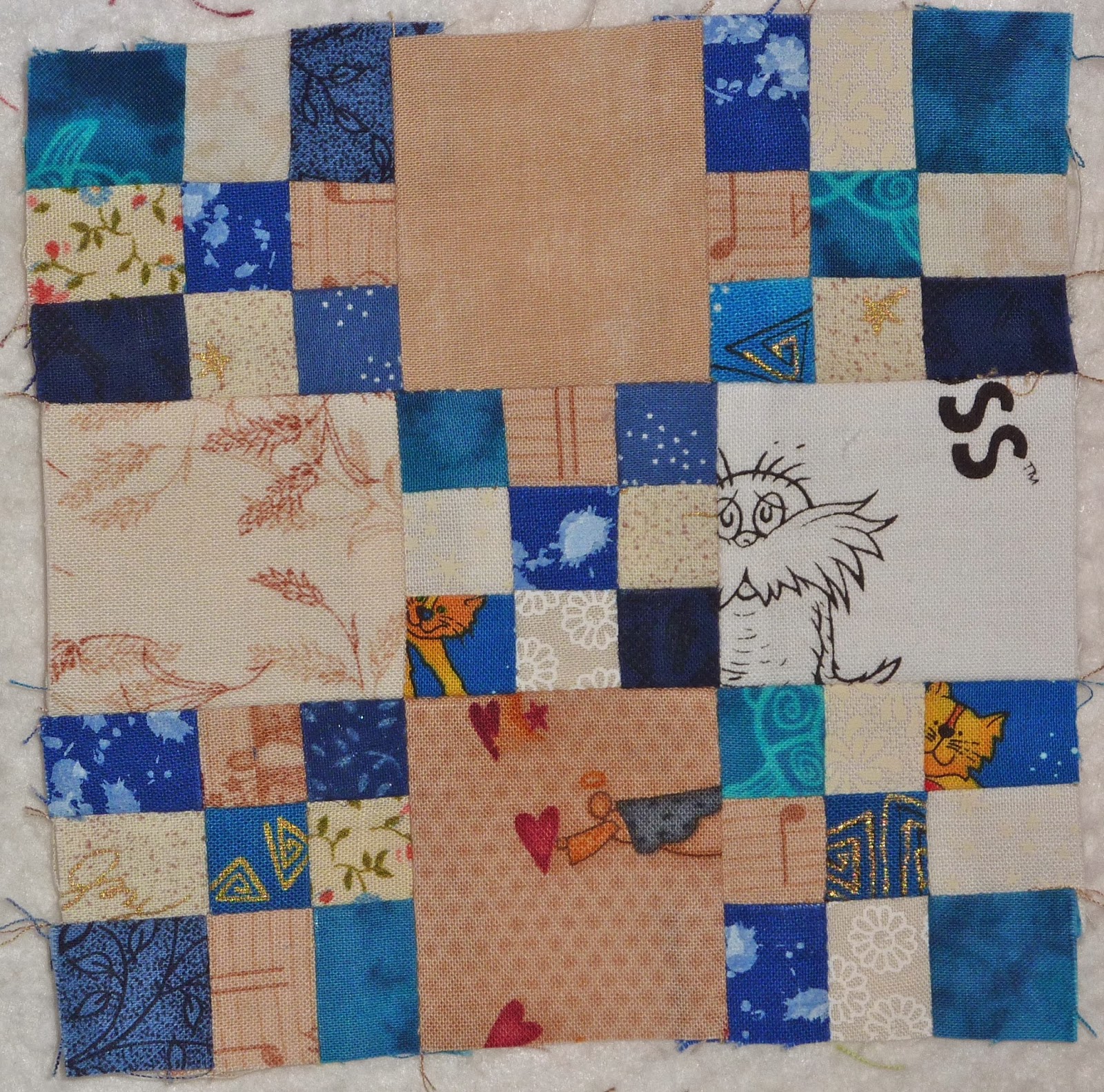 This is my first Omigosh block this year in blues, which is the colour for January. This project uses my tiniest scraps - 1" squares and strips for the 9 patches, and 2" squares of background neutrals. The 9 patch blocks finish at 1.5" and are cute as a button!