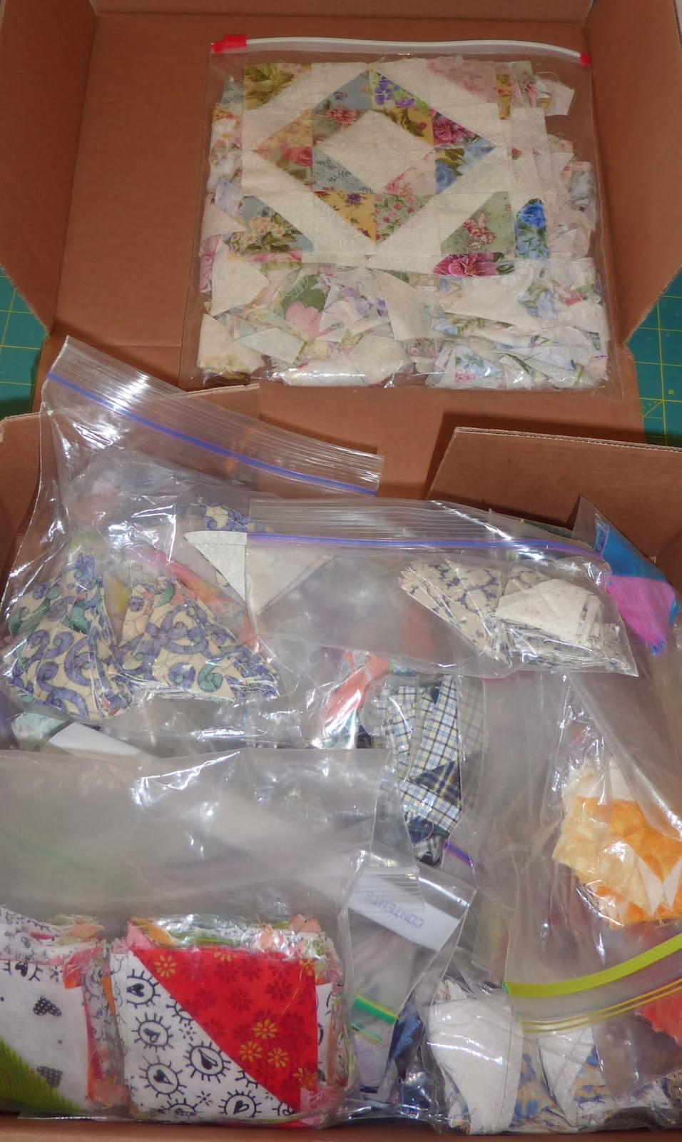I must brag to you that I have a wonderful and diverse collection! There are bags and bags of them sitting in boxes. Some of the projects are started, and some are just waiting for inspiration. I know where most of these bonus triangles have come from, the quilts that I have been finished long ago, and the scraps I have retrieved from trash cans at classes and retreats (yep... I'm a proud garbage picker!)
