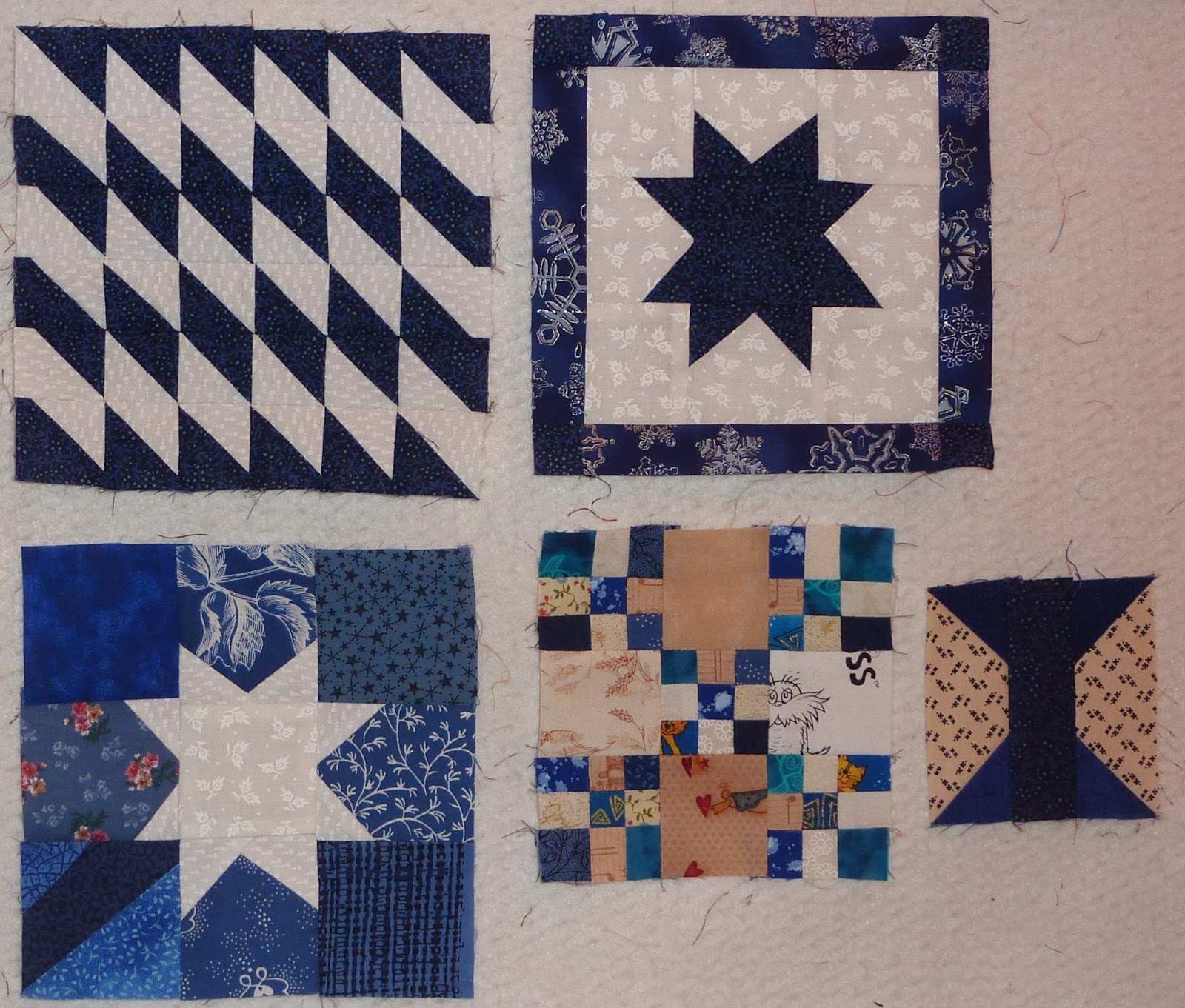 Here are my blocks this week. The top left is 36 HST's that were given to me by my friend Pat, and there are a few more to use up from that bag. The two star blocks use wonky scraps for the star points. These blocks are 6.5". Then there is my blue Omigosh block at 5" and my one and only blue spool block at 3.5". A pretty good start to the year!
