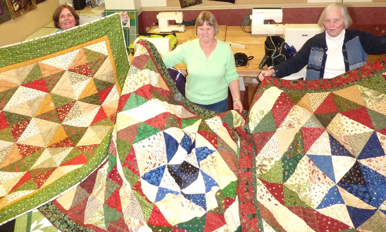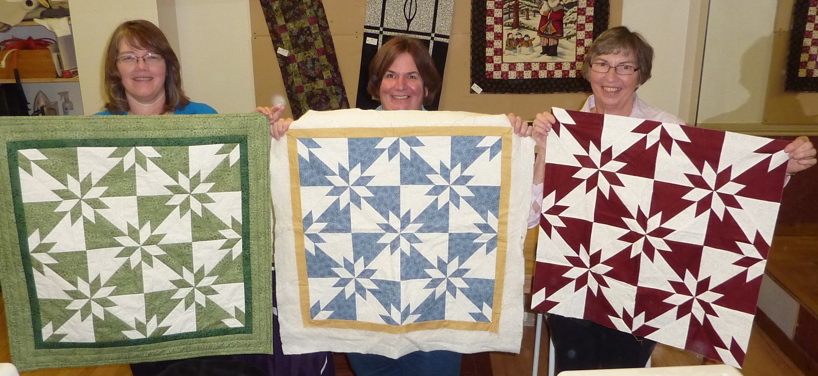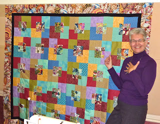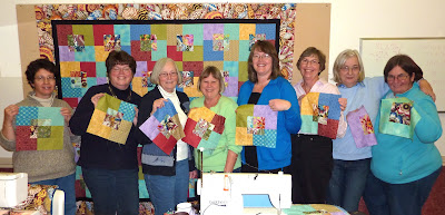 My sister had taken the class with me and she sent along her finished quilt top for guild show and share. Jake, who also had taken the class brought her quilt. AND Susan, a dedicated blog reader, decided to also make this quilt, and so we had FOUR buzzsaw quilts to show at guild meeting! Here we are...I am on the left, then Jake, and Susan, and Sandy is holding up my sister's quilt top. It was a very exciting show and share and I'm so glad I pushed myself to finish this quilt!