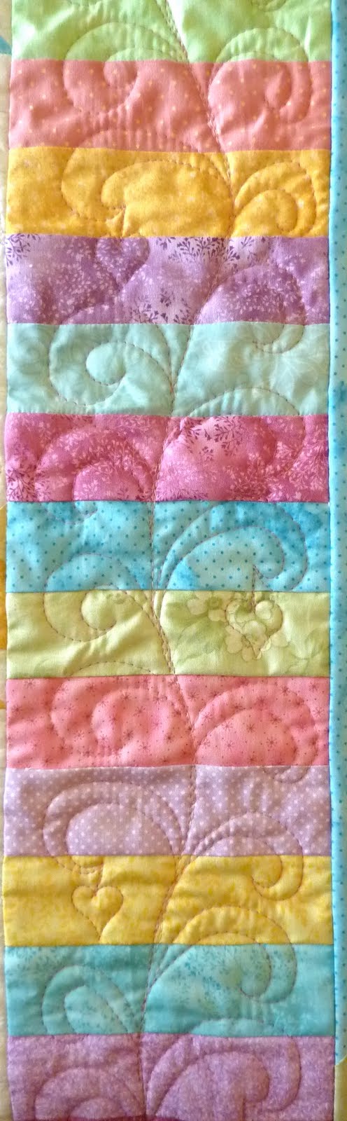 I quilted the border with my favorite swirly feathers (using my favorite pink Aurofil thread) with pointy curls, and added the occasional hanging heart...just for fun!