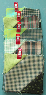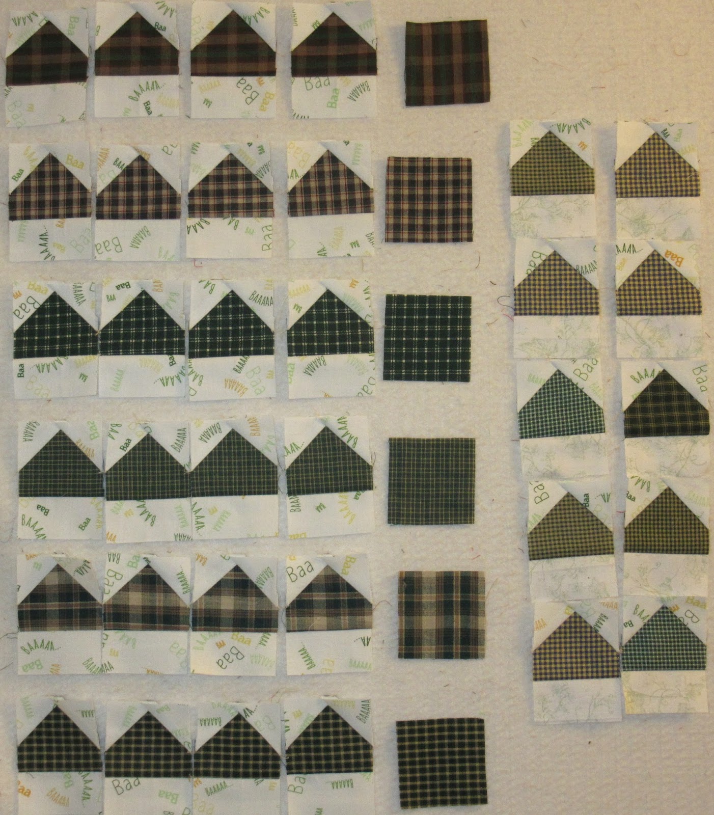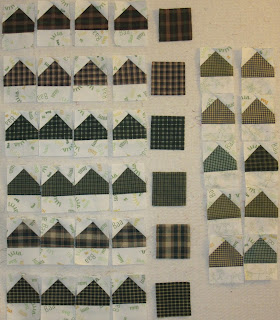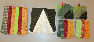 There are 3 different block patterns to sew for this step of the mystery and I made a sample of each block. However I sewed one of the sample blocks incorrectly, so right from the start I was using the seam ripper. The correct blocks have the paper notes pinned on, and the wrong block is under the seam ripper. It has since been dismantled! All the block components needed to sew the required number of blocks are now ready to mass assemble. Progress should be much faster now...fingers crossed!
