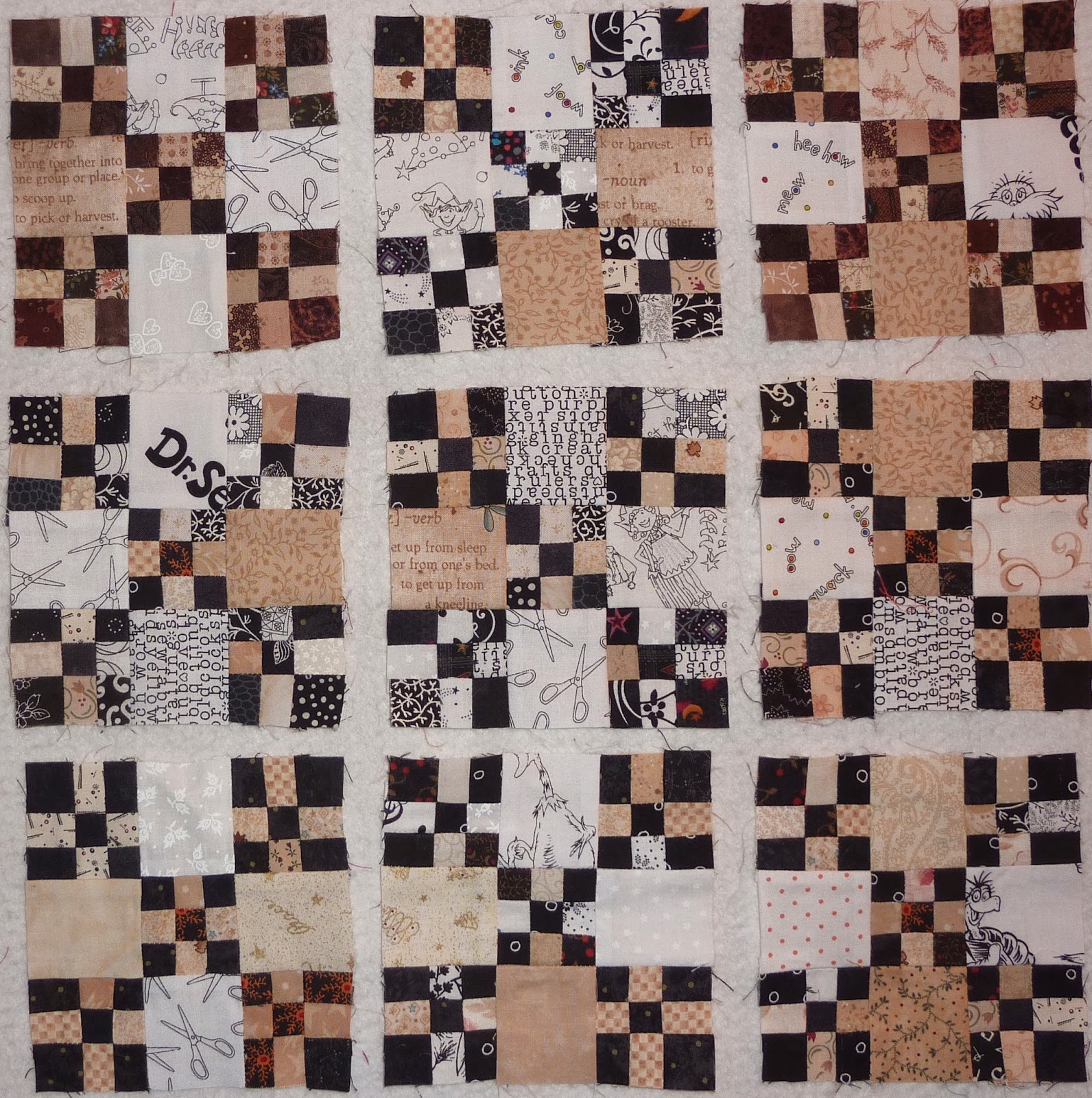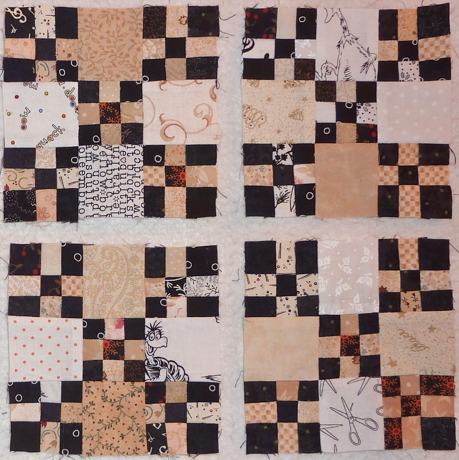 I decided to make the tiny 9 patch block backgrounds all scrappy neutrals, and thing it's working well so far. Black is an easy colour to work with in these blocks because of the contrast.