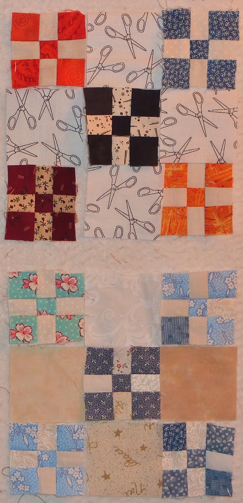 But do I want the blocks to be different colour 9 patches with the same background square fabrics (top block), OR do I want scrappy background squares and all the 9 patch blocks to be the same colour (bottom blue block) ?